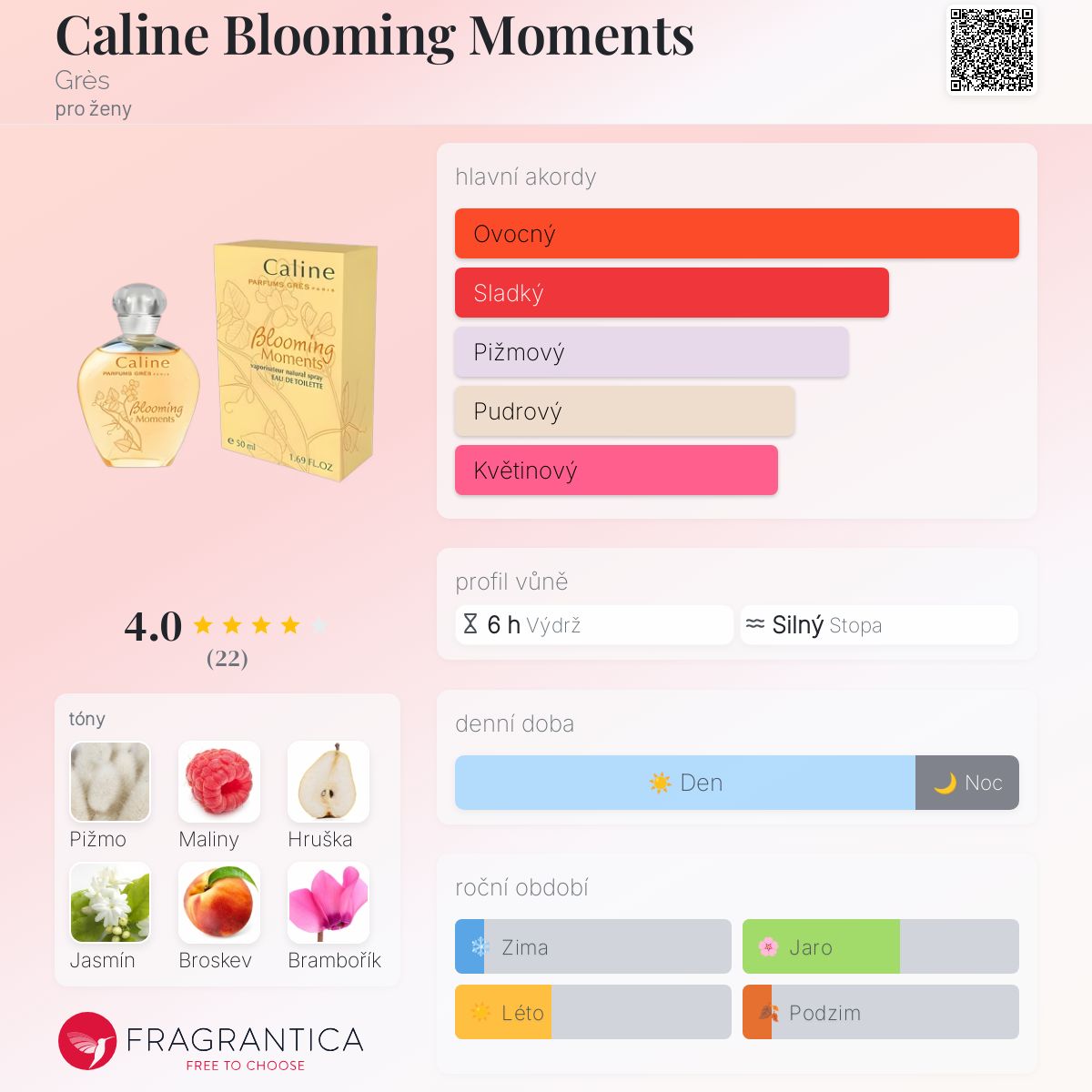 Caline Blooming Moments podle Grès je Floral Fruity vůně pro ženy. Caline Blooming Moments byl/a uveden/a v roce 2010. Caline Blooming Moments byl/a vytvořen/a Thomas Fontaine a Henri Bergia. Vrchní tóny jsou Hruška, Růžový pepř, Jablko, Mandarinka, Grapefruit a Citrón; střední tóny jsouVodní jasmín, Broskev, Brambořík, Frézie, Kořen orris a Pelargónie ; základní tóny jsou Pižmo, Maliny, Pačuli, Benzoin a Dubový mech.