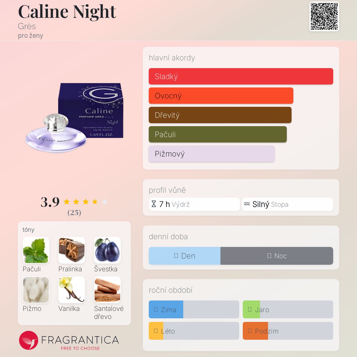 Caline Night podle Grès je Floral Fruity Gourmand vůně pro ženy. Caline Night byl/a uveden/a v roce 2006. "Nosem" za touto vůní je Thierry Wasser.