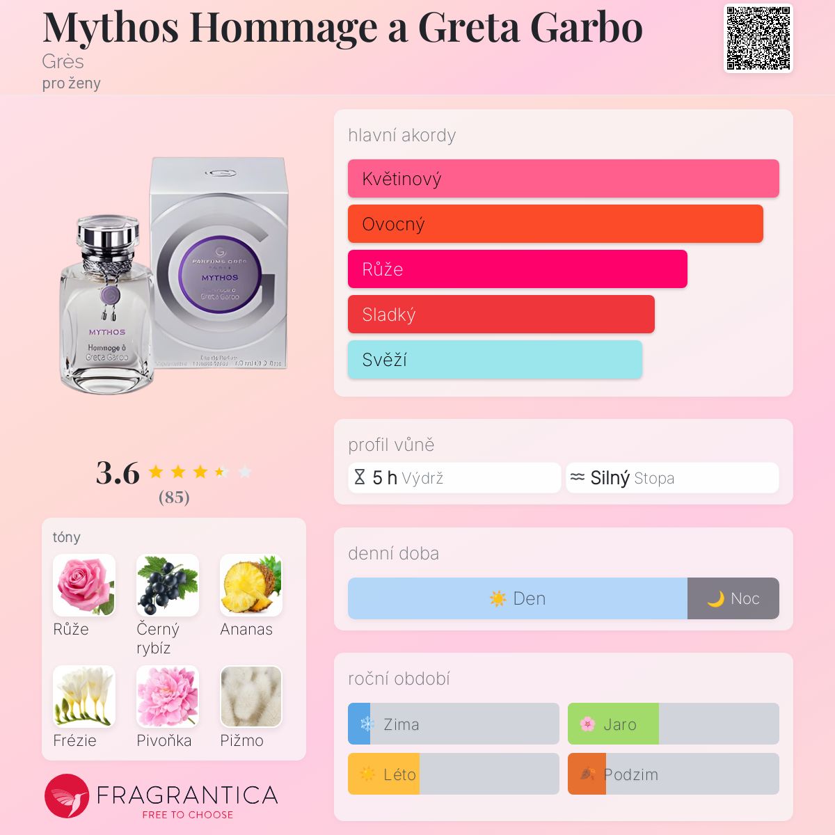 Mythos Hommage a Greta Garbo podle Grès je Floral Fruity vůně pro ženy. "Nosem" za touto vůní je Amandine Clerc-Marie. Vrchní tóny jsou Černý rybíz, Ananas, Pomeranč a Červené jablko; střední tóny jsouRůže, Frézie a Pivoňka ; základní tóny jsou Pižmo, Kosatec a Santalové dřevo.