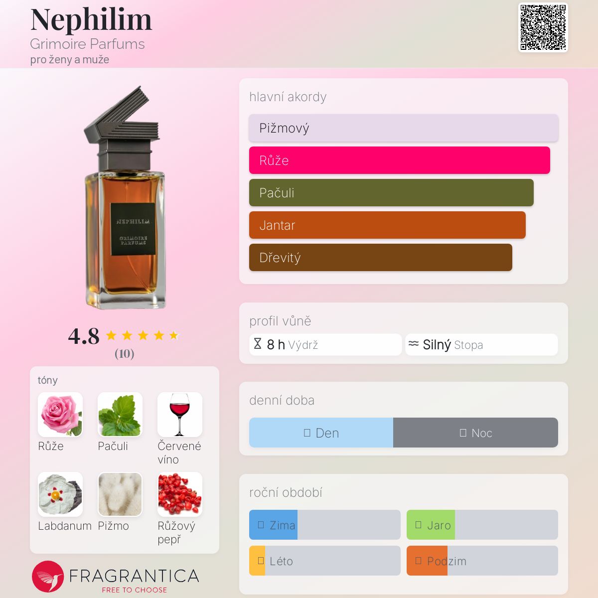 Nephilim podle Grimoire Parfums je Orientální Floral vůně pro ženy a muže. Toto je nová vůně. Nephilim byl/a uveden/a v roce 2025. "Nosem" za touto vůní je Trung Vu. Vrchní tóny jsou Červené víno, Růžový pepř, Rajčatový list, Andělika, Citrón a Břečťan; střední tóny jsouBulharská růže, Francouzská růže, Karafiát, Levandule, Pelargónie a Choya Loban ; základní tóny jsou Pačuli, Labdanum, Pižmo, Balzám Tolu, Opoponax, Vanilka a Cibetka.