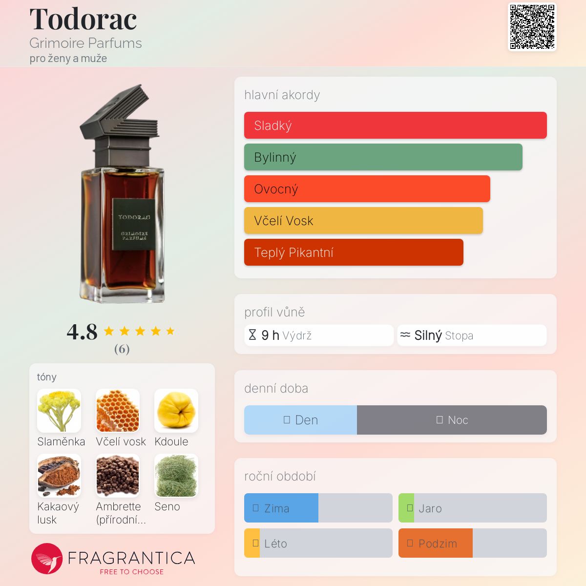 Todorac podle Grimoire Parfums je vůně pro ženy a muže. Toto je nová vůně. Todorac byl/a uveden/a v roce 2025. "Nosem" za touto vůní je Trung Vu. Vrchní tóny jsou Kakao, Vonokvětka, Švestka, Badyán a Celer; střední tóny jsouSlaměnka, Kdoule, Šalvěj muškátová, Liatrix, Dub a Janovec ; základní tóny jsou Včelí vosk, Ambrette (přírodní pižmo), Seno, Tabák, Santalové dřevo a Myrha.