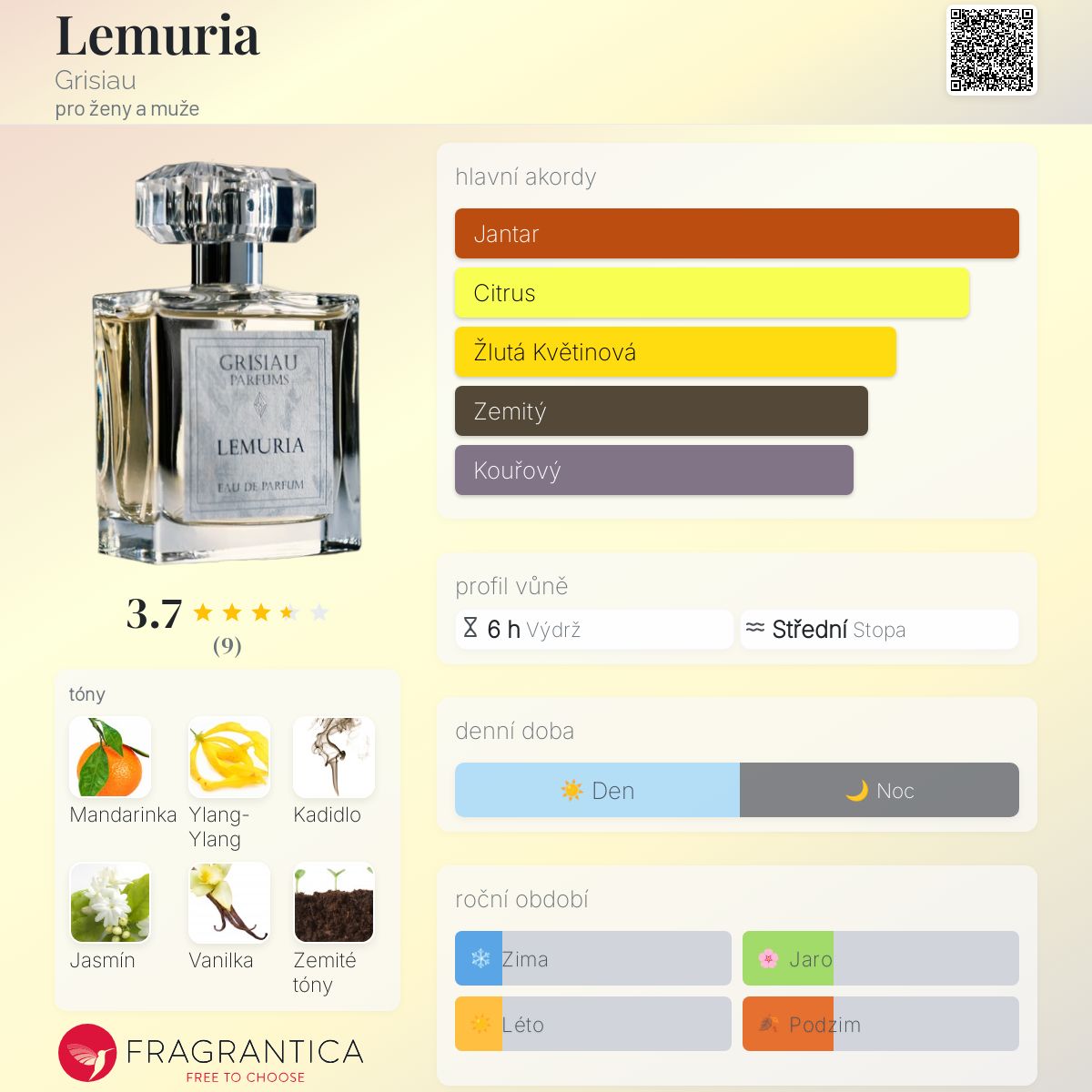 Lemuria podle Grisiau je vůně pro ženy a muže. Lemuria byl/a uveden/a v roce 2022. "Nosem" za touto vůní je Roger Howell. Vrchní tóny jsou Mandarinka, Zelené listí a Bergamot; střední tóny jsouYlang-Ylang, Jasmín a Vanilka ; základní tóny jsou Kadidlo, Zemité tóny, Jantar (ambra), Pižmo a Vetiver.