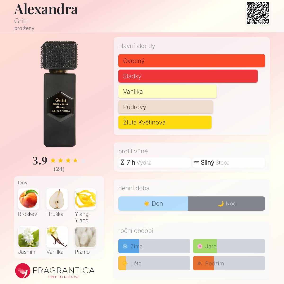 Alexandra podle Gritti je Orientální Floral vůně pro ženy. Alexandra byl/a uveden/a v roce 2016. Vrchní tóny jsou Broskev, Hruška, Mandarinka, Růžový grapefruit, Bergamot a Pelyněk; střední tóny jsouYlang-Ylang, Jasmín, Damašská růže a Pomerančový květ ; základní tóny jsou Vanilka, Pižmo, Fazole tonka, Kašmírové dřevo, Jantar (ambra), Pačuli a Šafrán.