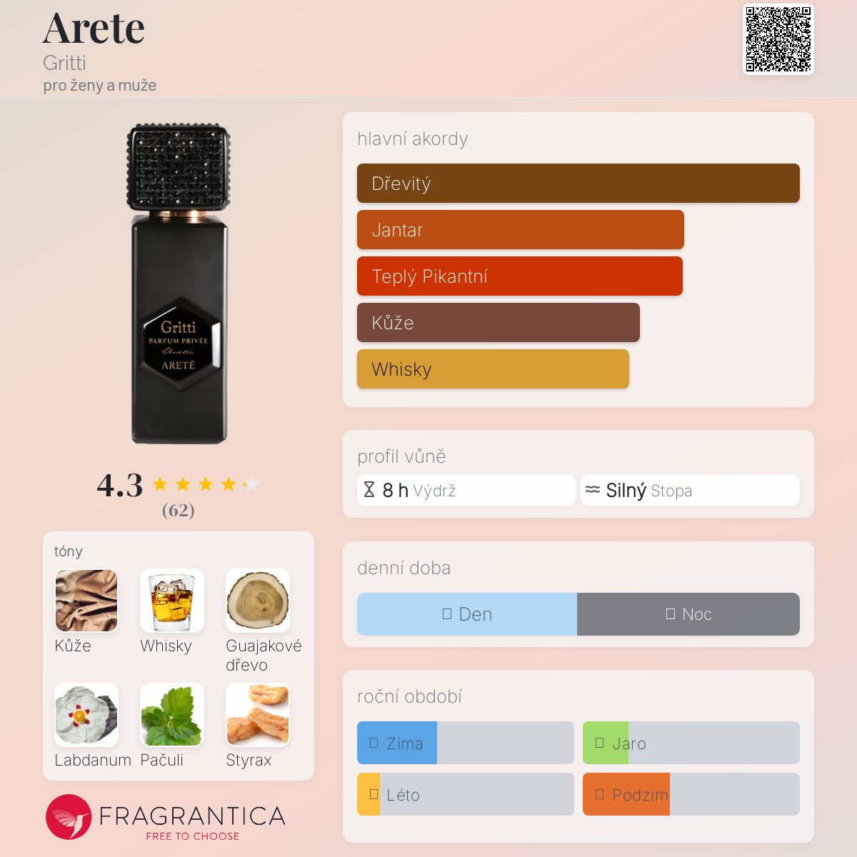 Arete podle Gritti je Leather vůně pro ženy a muže. Arete byl/a uveden/a v roce 2015. Vrchní tóny jsou Labdanum, Skořice, Kardamom a Bergamot; střední tóny jsouKůže a Whisky ; základní tóny jsou Guajakové dřevo, Pačuli, Styrax, Santalové dřevo, Vanilka, Ambroxan, Haitský vetiver a Pižmo.