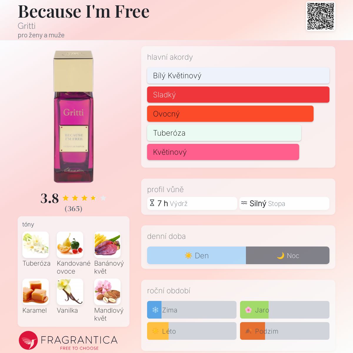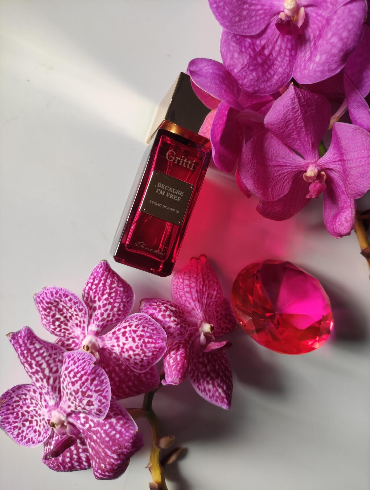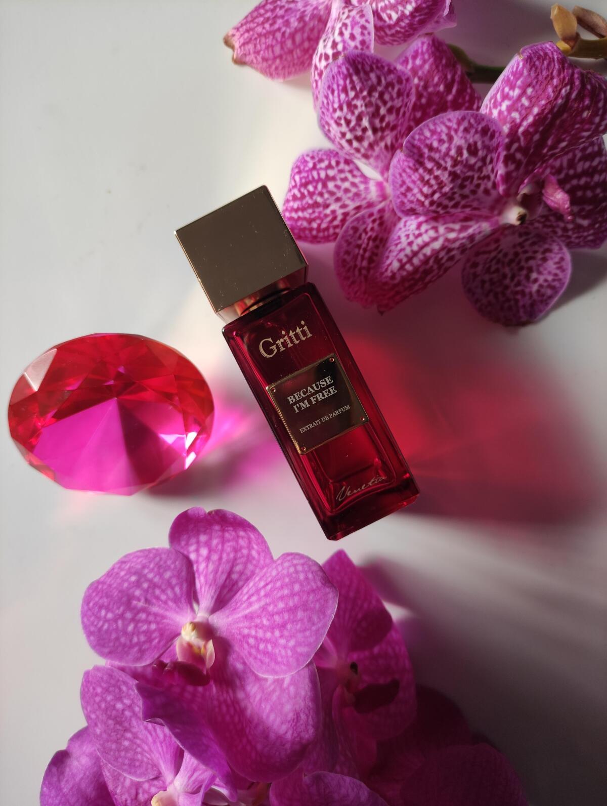 Because I'm Free podle Gritti je Floral Fruity Gourmand vůně pro ženy a muže. Because I'm Free byl/a uveden/a v roce 2023. "Nosem" za touto vůní je Luca Gritti. Vrchní tóny jsou Kandované ovoce, Mandlový květ a Petitgrain; střední tóny jsouTuberóza, Banánový květ a Jasmín ; základní tóny jsou Karamel, Vanilka a Jantar (ambra).