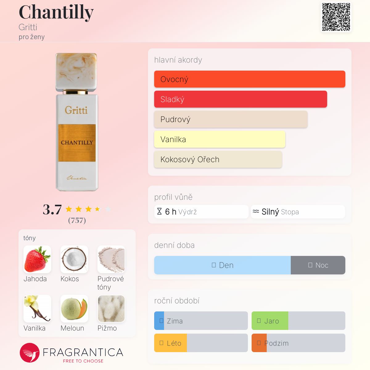 Chantilly podle Gritti je Floral Fruity Gourmand vůně pro ženy. Chantilly byl/a uveden/a v roce 2018. "Nosem" za touto vůní je Luca Gritti. Vrchní tóny jsou Jahoda, Meloun, Mandarinka, Pomeranč a Bergamot; střední tóny jsouKokos, Jablko, Květinové tóny a Černý rybíz ; základní tóny jsou Pudrové tóny, Vanilka a Pižmo.