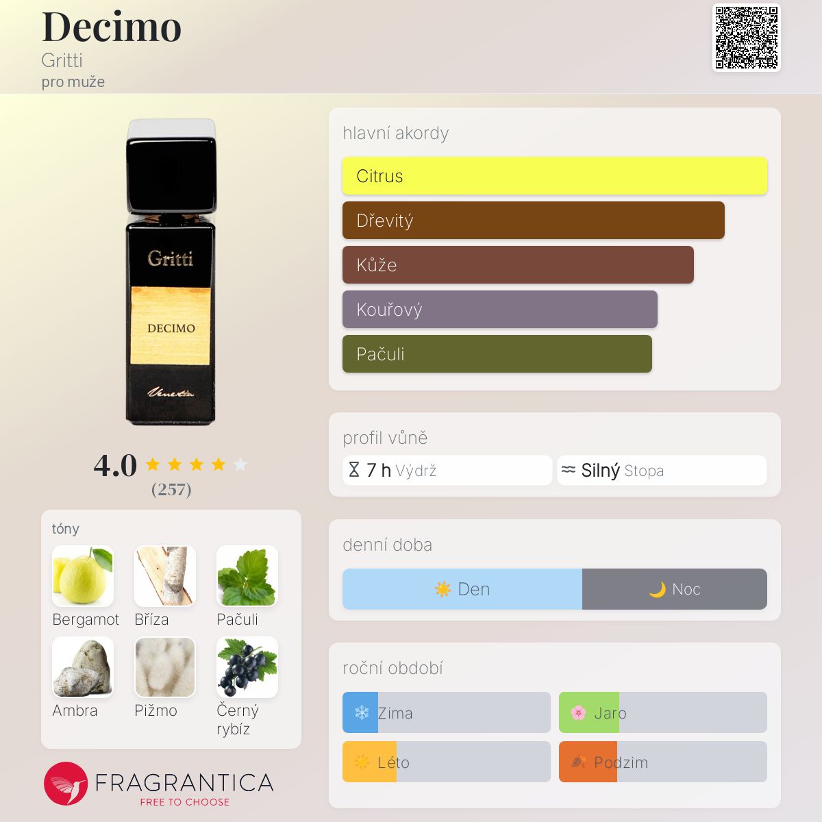 Decimo podle Gritti je Orientální Fougere vůně pro muže. Decimo byl/a uveden/a v roce 2016. Vrchní tóny jsou Bergamot, Černý rybíz a Neroli; střední tóny jsouBříza, Pačuli a Růže ; základní tóny jsou Ambra, Pižmo a Vanilka.