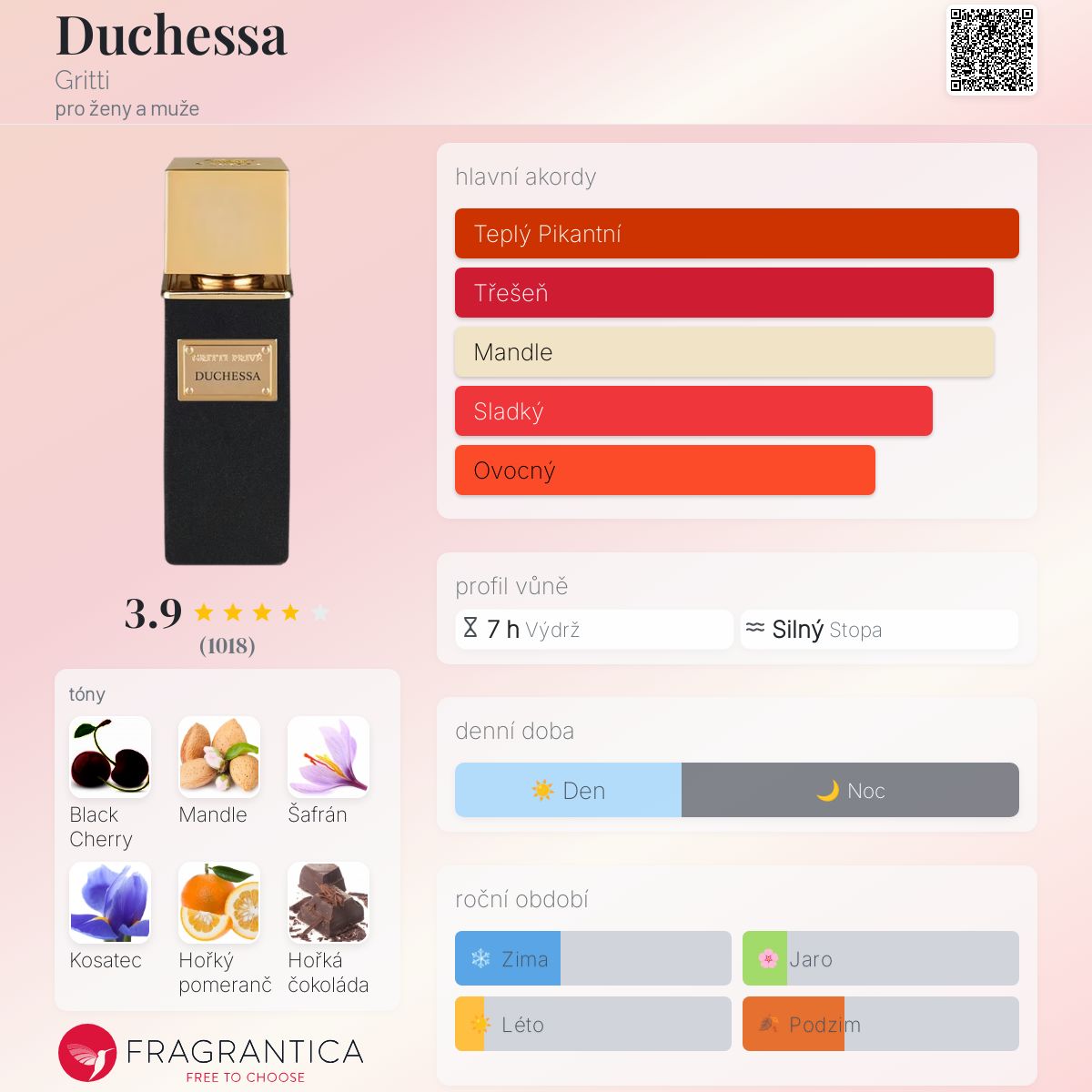 Duchessa podle Gritti je Floral Fruity Gourmand vůně pro ženy a muže. Duchessa byl/a uveden/a v roce 2020. "Nosem" za touto vůní je Luca Gritti. Vrchní tóny jsou Černá třešeň, Šafrán, Hořký pomeranč a Broskev; střední tóny jsouČokoláda, Hřebíček a Jasmín ; základní tóny jsou Sladká mandle, Kosatec a Hnědý cukr.
