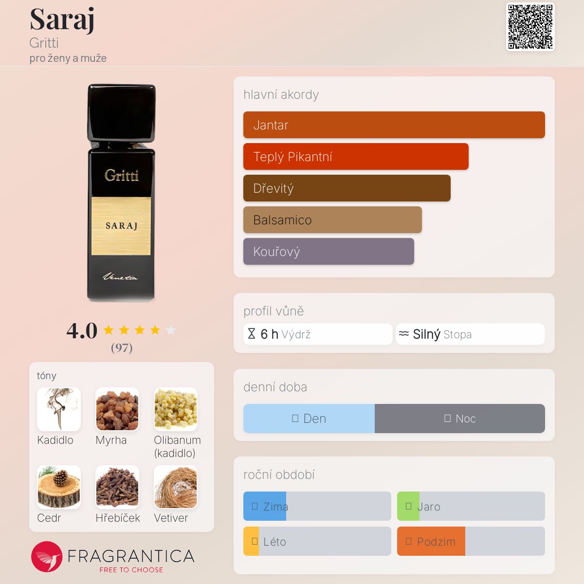 Saraj podle Gritti je Woody Spicy vůně pro ženy a muže. Vrchní tóny jsou Olibanum, Skořice, Andělika a Limetka; střední tóny jsouVirginský cedr, Hřebíček, Vetiver, Labdanum a Egyptský jasmín ; základní tóny jsou Kadidlo, Myrha a Pižmo.