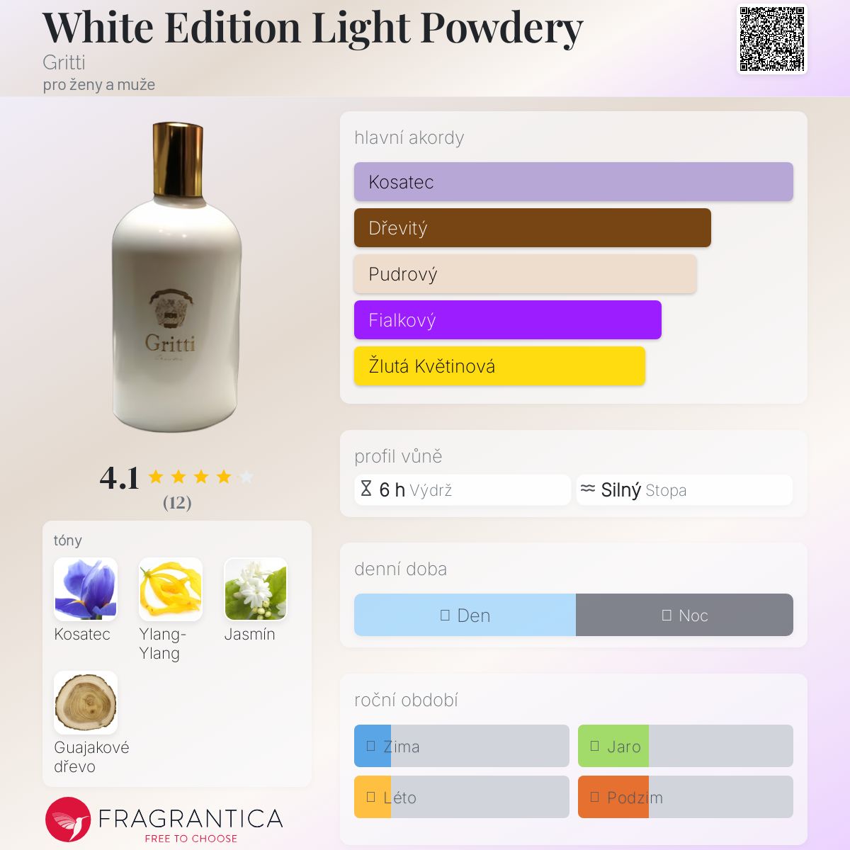 White Edition Light Powdery podle Gritti je Floral Woody Musk vůně pro ženy a muže. White Edition Light Powdery byl/a uveden/a v roce 2013. Vrchní tón je Ylang-Ylang ; střední tóny jsouKosatec a Jasmín ; základní tón je Guajakové dřevo.