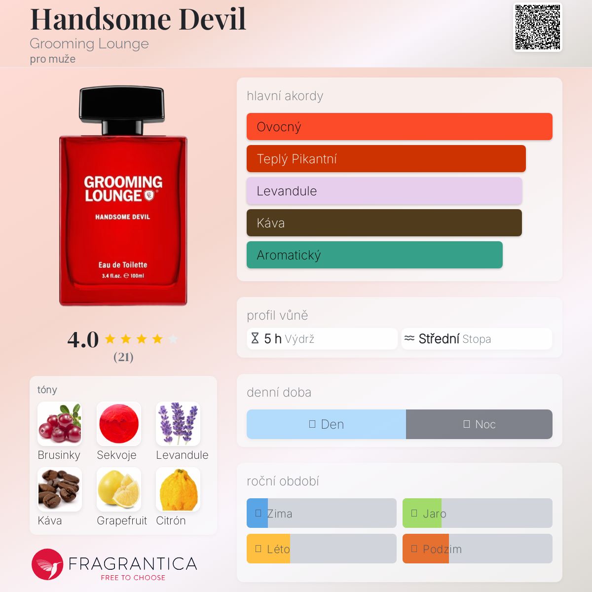 Handsome Devil podle Grooming Lounge je Woody Spicy vůně pro muže. Handsome Devil byl/a uveden/a v roce 2023. Vrchní tóny jsou Brusinky, Růžový grapefruit a Citrón; střední tóny jsouLevandule, Šafrán a Šalvěj ; základní tóny jsou Sekvoje, Káva a Jantar (ambra).