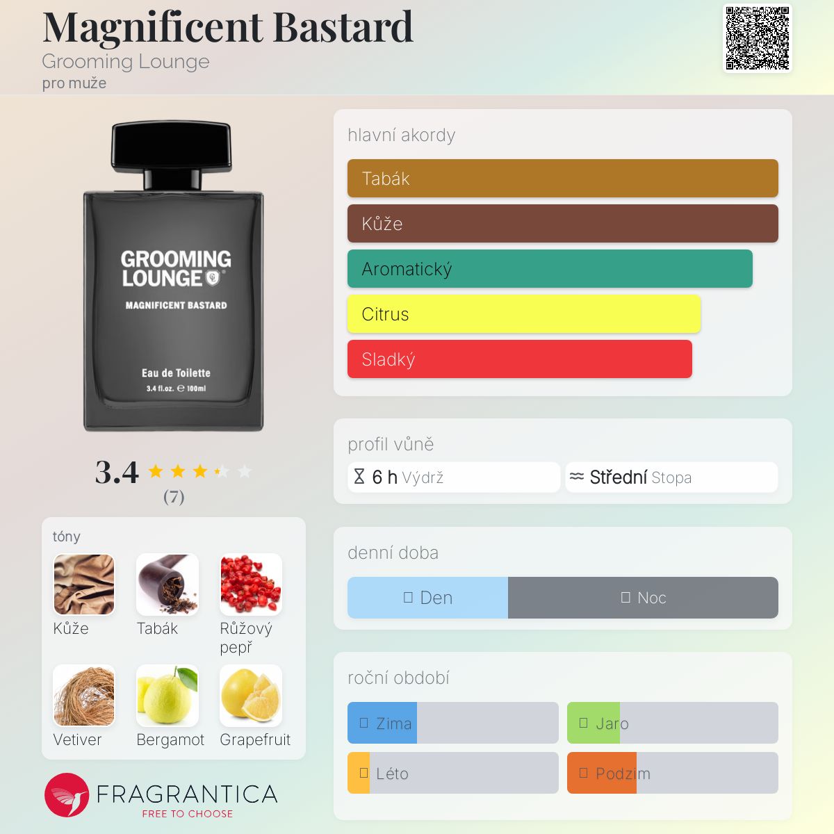 Magnificent Bastard podle Grooming Lounge je Leather vůně pro muže. Magnificent Bastard byl/a uveden/a v roce 2023. Vrchní tóny jsou Bergamot a Grapefruit; střední tóny jsouRůžový pepř a Elimi ; základní tóny jsou Kůže, Tabák a Vetiver.