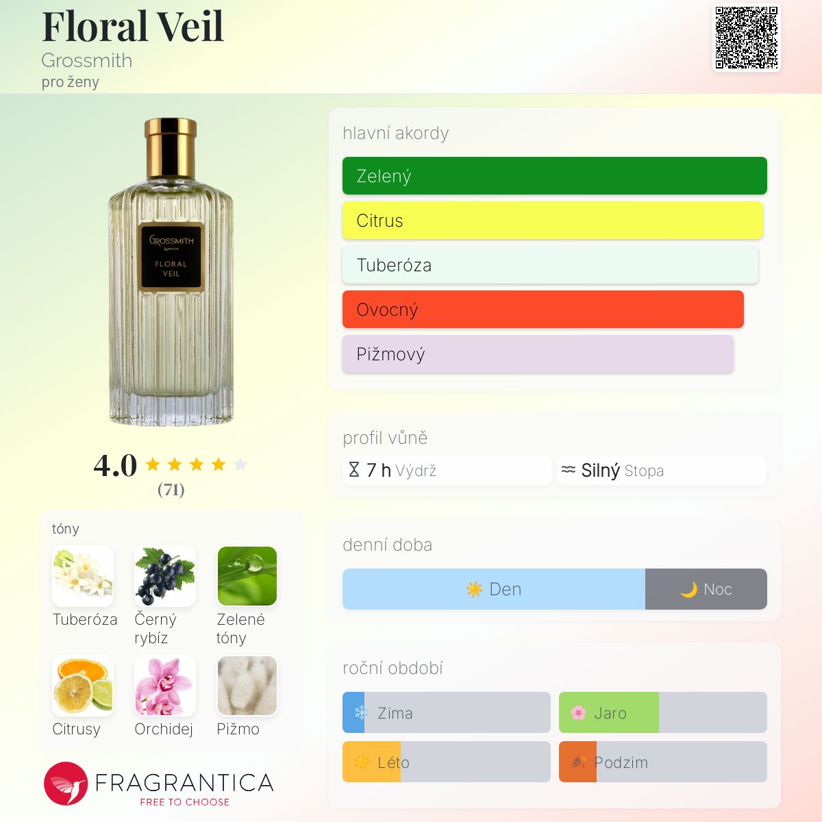Floral Veil podle Grossmith je Floral vůně pro ženy. Floral Veil byl/a uveden/a v roce 2012. "Nosem" za touto vůní je Jean-Marie Santantoni. Vrchní tóny jsou Černý rybíz, Zelené tóny, Citrusy a Citrón; střední tóny jsouTuberóza, Vanilková orchidej, Pelargónie, Ylang-Ylang a Růže ; základní tóny jsou Pižmo, Kašmír a Jantar (ambra).
