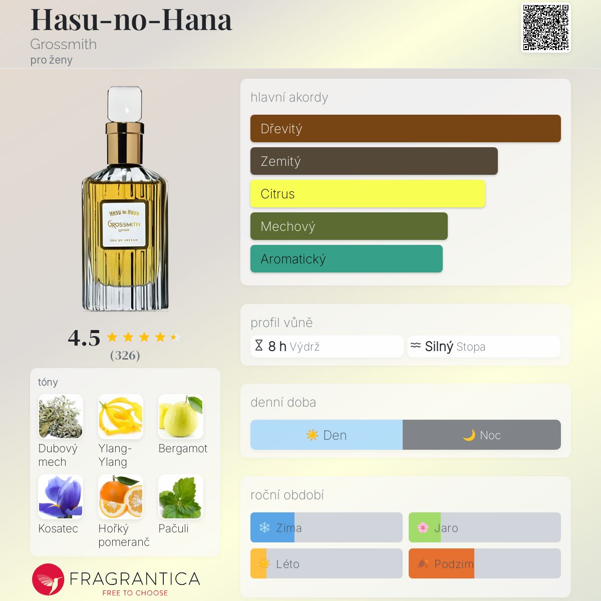 Hasu-no-Hana podle Grossmith je Chypre Floral vůně pro ženy. "Nosem" za touto vůní je Richard Melchio. Vrchní tóny jsou Bergamot a Hořký pomeranč; střední tóny jsouDubový mech, Ylang-Ylang, Kosatec, Jasmín, Tinktura z růže a Lotus ; základní tóny jsou Pačuli, Vetiver, Fazole tonka, Santalové dřevo a Virginský cedr.