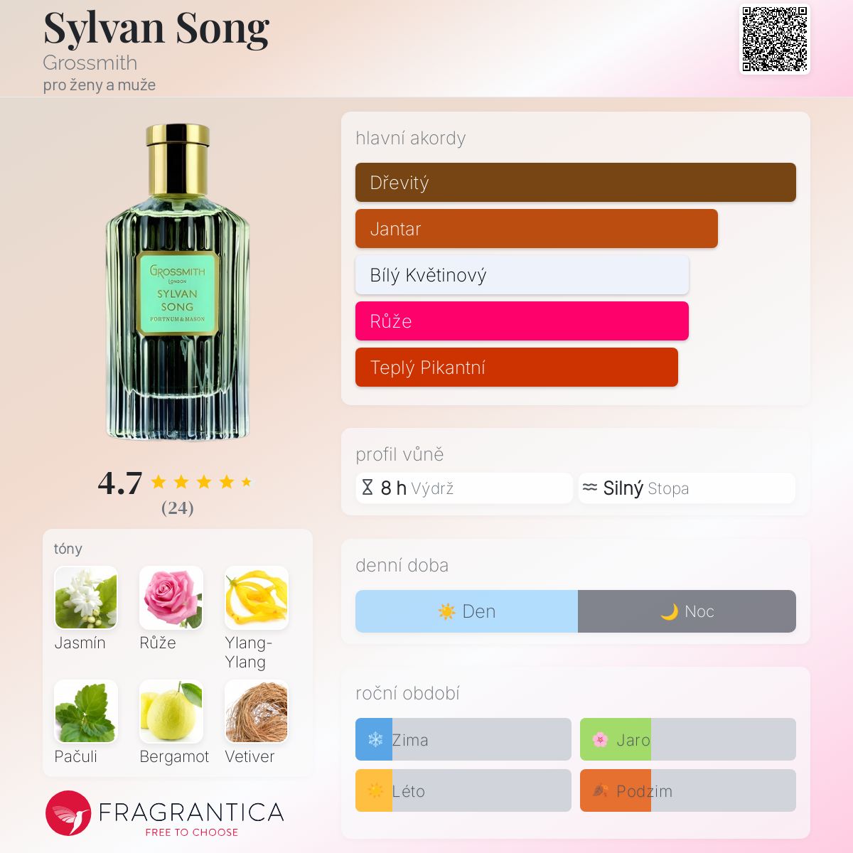 Sylvan Song podle Grossmith je Floral Woody Musk vůně pro ženy a muže. Sylvan Song byl/a uveden/a v roce 2014. "Nosem" za touto vůní je Celine Guivarch. Vrchní tón je Bergamot ; střední tóny jsouJasmín, Růže a Ylang-Ylang ; základní tóny jsou Pačuli, Vetiver, Benzoin, Kadidlo, Fazole tonka, Pižmo a Guajakové dřevo.