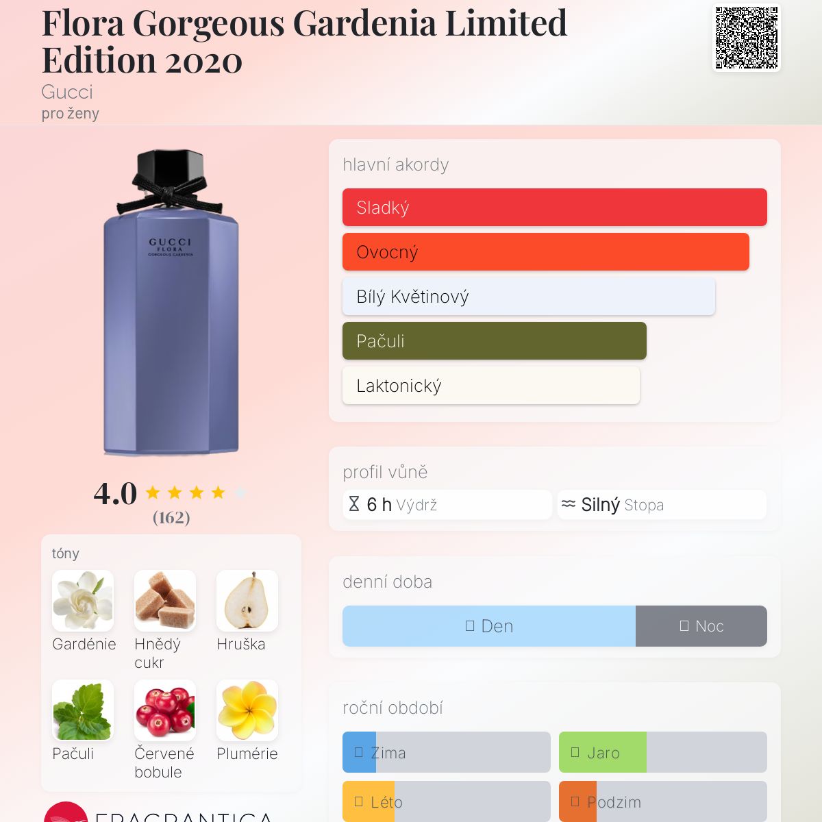 Flora Gorgeous Gardenia Limited Edition 2020 podle Gucci je Floral Fruity vůně pro ženy. Flora Gorgeous Gardenia Limited Edition 2020 byl/a uveden/a v roce 2020. Vrchní tóny jsou Hruška a Červené bobule; střední tóny jsouGardénie a Plumérie ; základní tóny jsou Hnědý cukr a Pačuli.