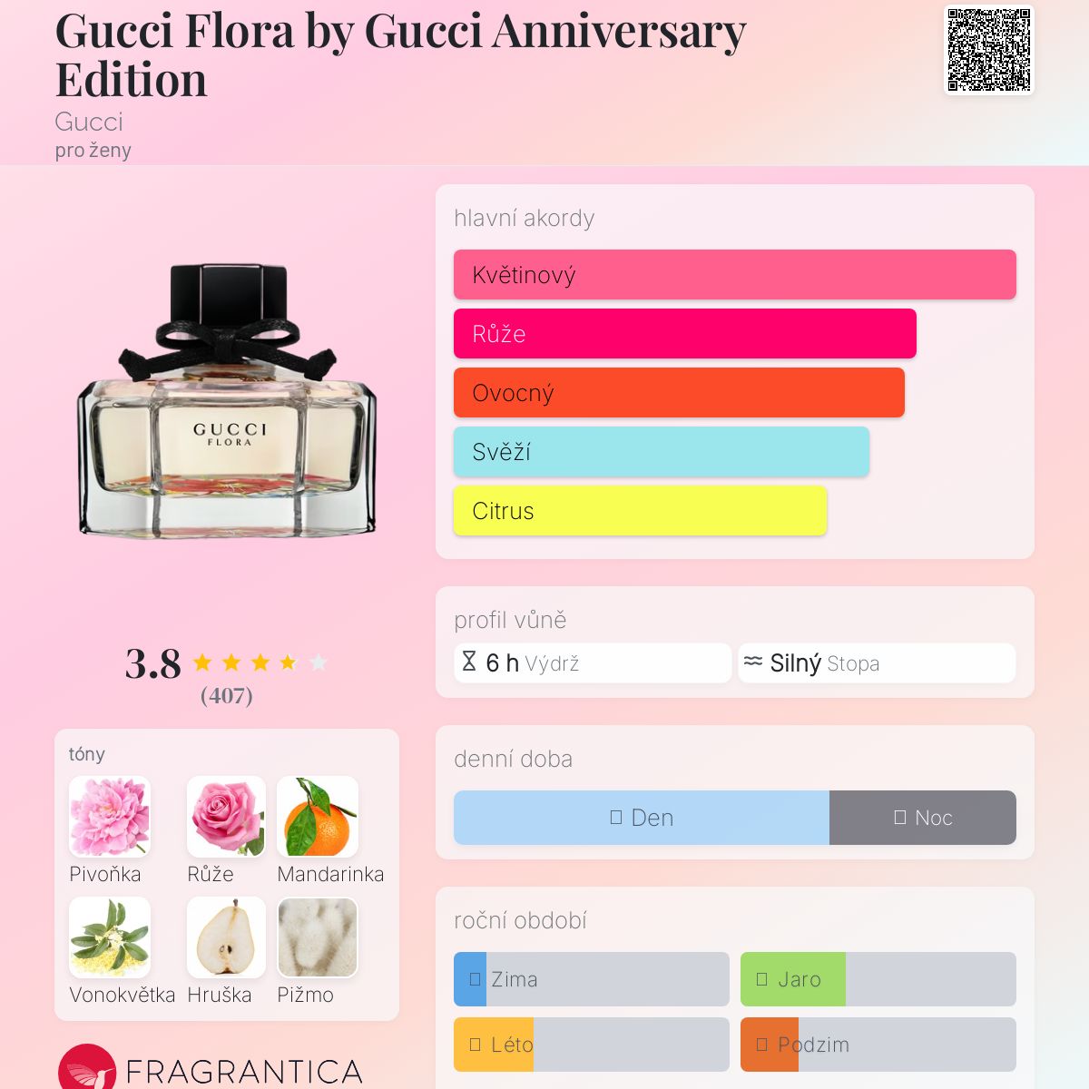 Gucci Flora by Gucci Anniversary Edition podle Gucci je Floral vůně pro ženy. Gucci Flora by Gucci Anniversary Edition byl/a uveden/a v roce 2016. Vrchní tóny jsou Mandarinka, Hruška a Pepř; střední tóny jsouPivoňka, Růže a Vonokvětka ; základní tóny jsou Pižmo, Pačuli, Cedr a Kůže.