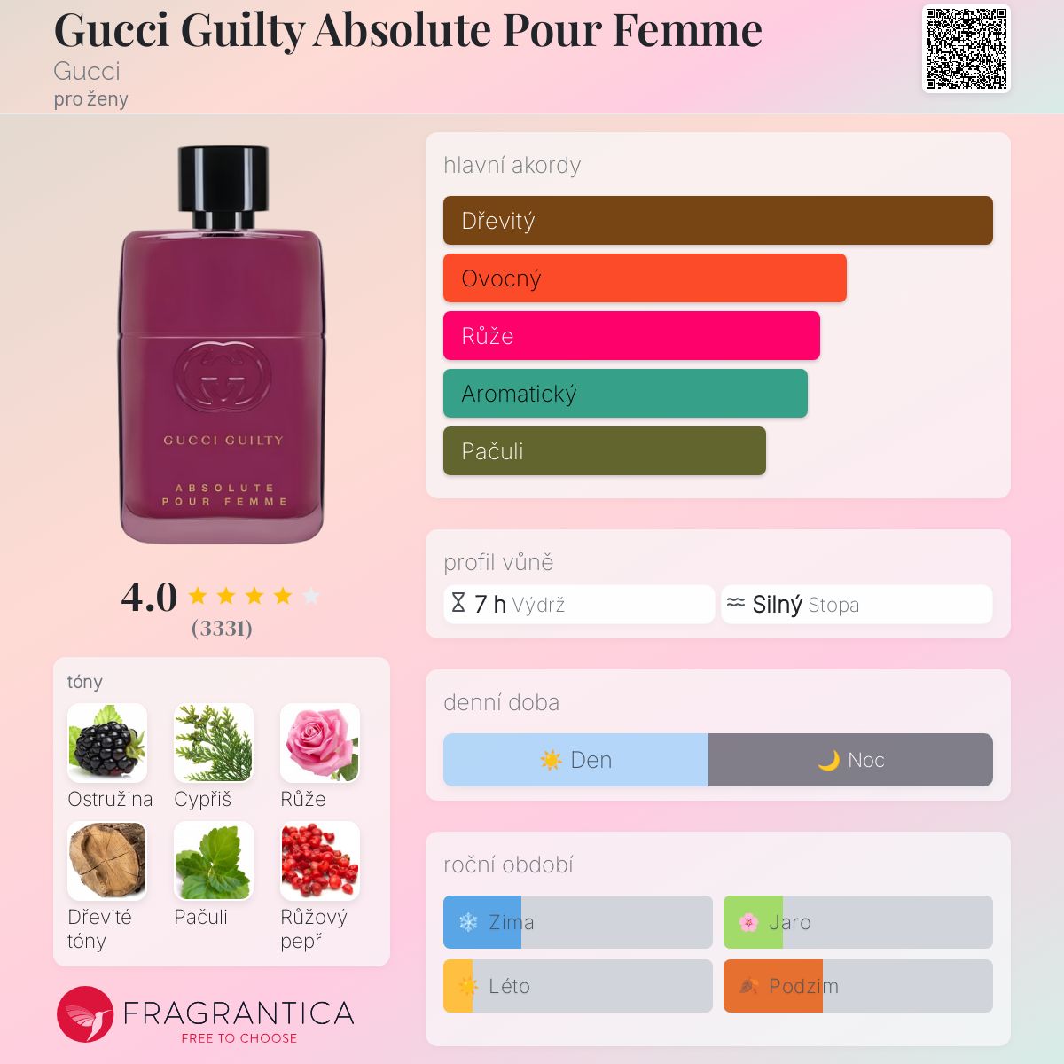Guilty Absolute je ovocná chypre vůně ideální pro sebevědomé, odhodlané a charakterní ženy. Tato vůně má velmi mužný nádech, který ji odlišuje od běžných parfémů, které v současné době vycházejí z módy (což se mi líbí); působí téměř jako niche parfém! Myslím, že je to zcela unisexový parfém, který se dá nosit na podzim/zimu, ale kdykoli.