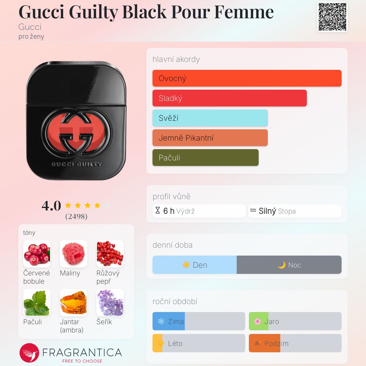 Gucci Guilty Black Pour Femme podle Gucci je Orientální Floral vůně pro ženy. Gucci Guilty Black Pour Femme byl/a uveden/a v roce 2013. "Nosem" za touto vůní je Aurélien Guichard. Vrchní tóny jsou Červené bobule a Růžový pepř; střední tóny jsouMaliny, Šeřík, Fialka, Broskev a Červený rybíz ; základní tóny jsou Pačuli, Jantar (ambra) a Karamel.