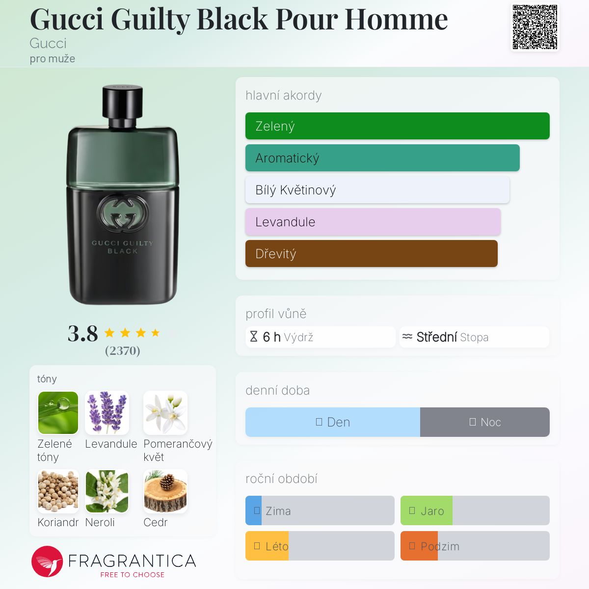 Gucci Guilty Black Pour Homme podle Gucci je Aromatic Fougere vůně pro muže. Gucci Guilty Black Pour Homme byl/a uveden/a v roce 2013. Vrchní tóny jsou Levandule a Zelený koriandr; střední tóny jsouZelené tóny, Pomerančový květ a Neroli ; základní tóny jsou Cedr a Pačuli.