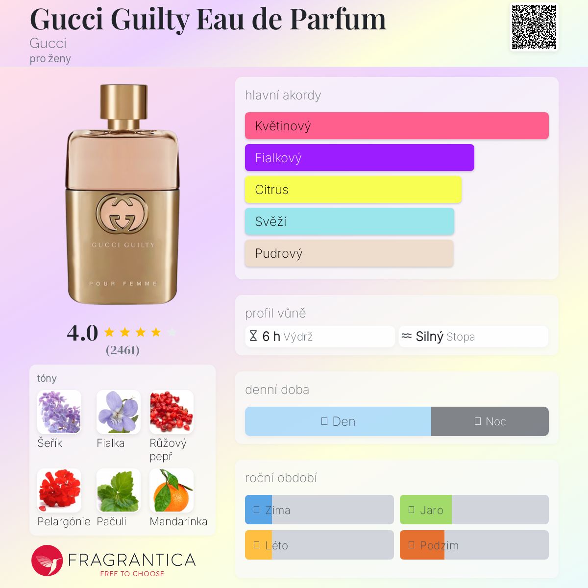 Gucci Guilty Eau de Parfum podle Gucci je Orientální Floral vůně pro ženy. Gucci Guilty Eau de Parfum byl/a uveden/a v roce 2019. Vrchní tóny jsou Růžový pepř, Mandarinka a Bergamot; střední tóny jsouŠeřík, Fialka, Pelargónie a Růže ; základní tóny jsou Pačuli a Jantar (ambra).