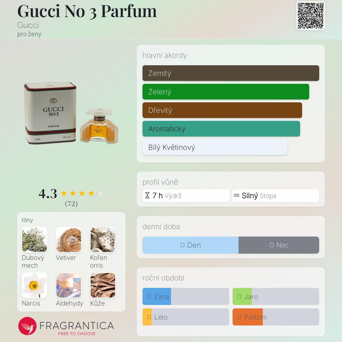 Gucci No 3 Parfum podle Gucci je Chypre Floral vůně pro ženy. Gucci No 3 Parfum byl/a uveden/a v roce 1985. "Nosem" za touto vůní je Firmenich.