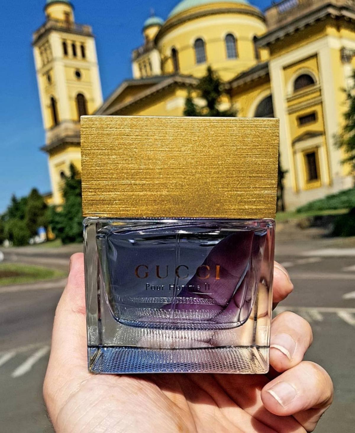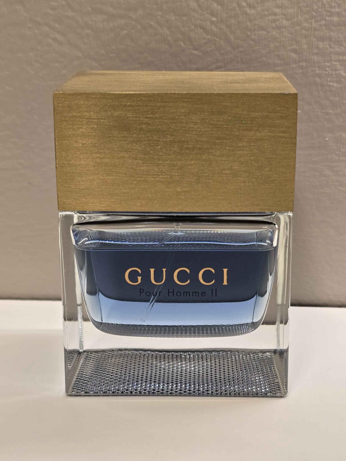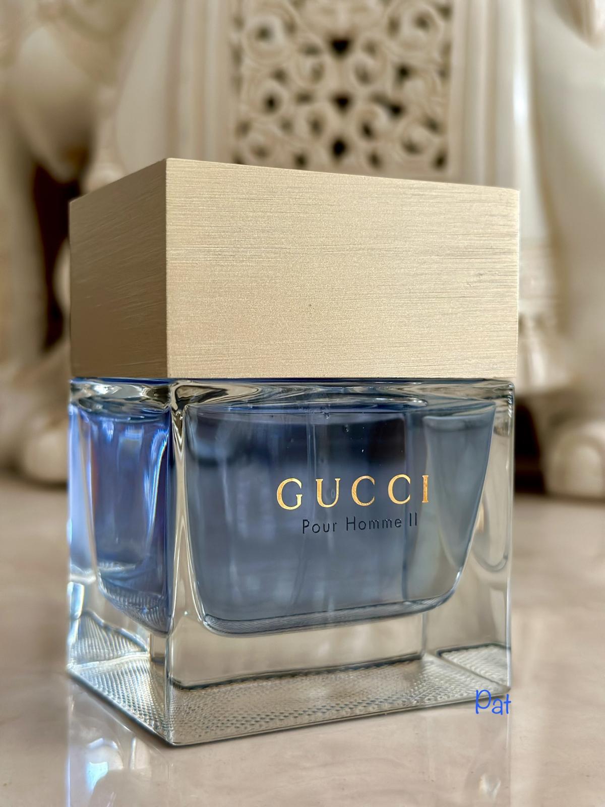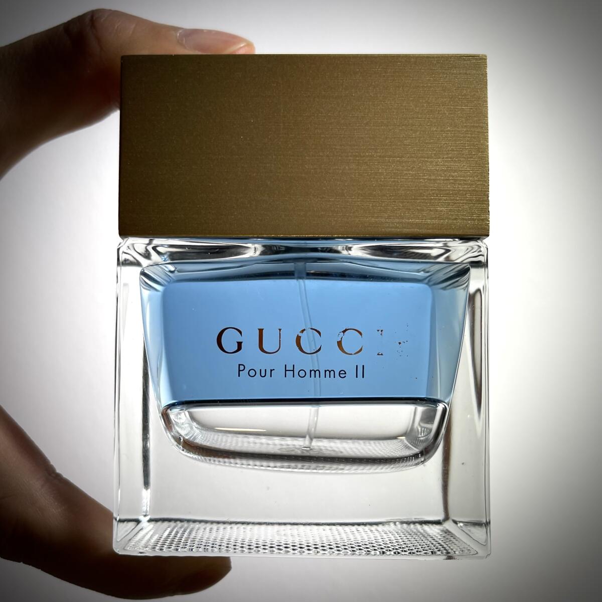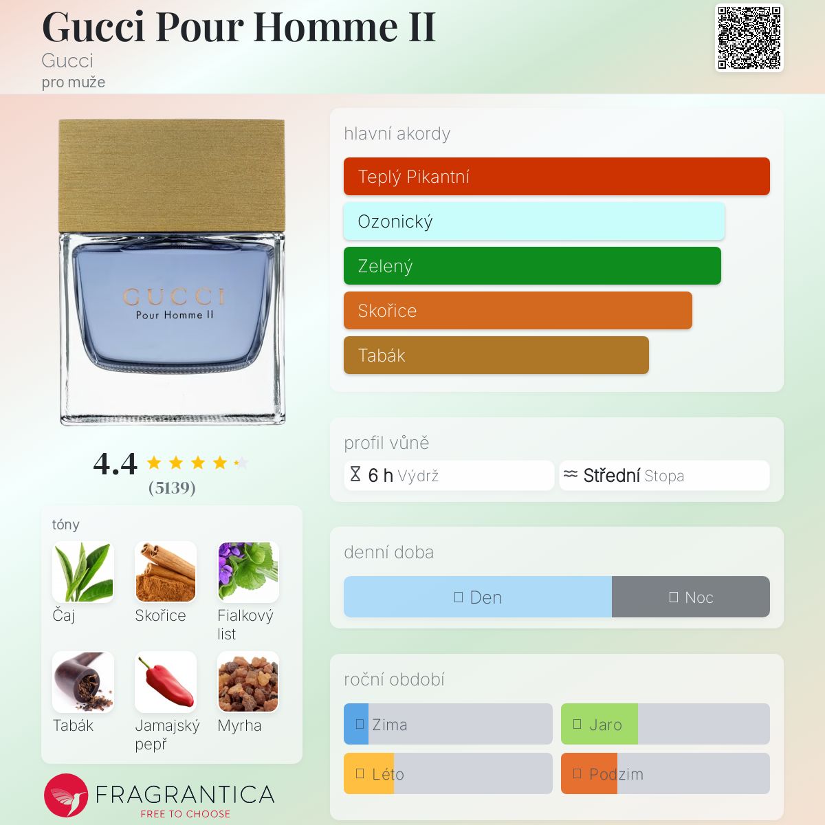 Gucci Pour Homme II podle Gucci je Woody Spicy vůně pro muže. Gucci Pour Homme II byl/a uveden/a v roce 2007. "Nosem" za touto vůní je Karine Dubreuil-Sereni. Vrchní tóny jsou Fialkový list a Bergamot; střední tóny jsouČerný čaj, Skořice a Jamajský pepř ; základní tóny jsou Tabákový list, Myrha, Pižmo a Olivovník.