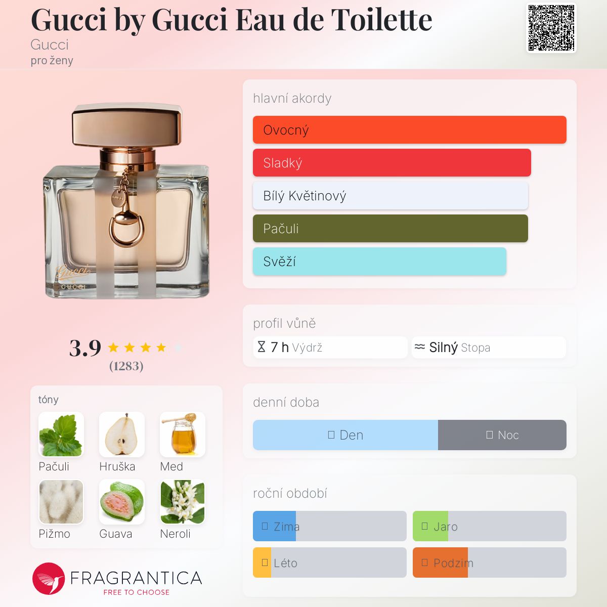 Gucci by Gucci Eau de Toilette podle Gucci je Chypre Floral vůně pro ženy. Gucci by Gucci Eau de Toilette byl/a uveden/a v roce 2008. "Nosem" za touto vůní je Ilias Ermenidis. Vrchní tóny jsou Hruška a Guava; střední tóny jsouNeroli, Konvalinka a Květ tahitské gardénie ; základní tóny jsou Pačuli, Med a Pižmo.