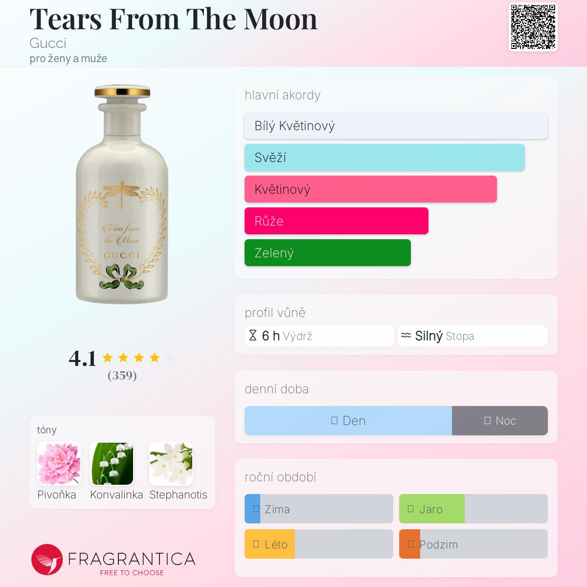 Tears From The Moon podle Gucci je Floral vůně pro ženy a muže. Tears From The Moon byl/a uveden/a v roce 2022. "Nosem" za touto vůní je Alberto Morillas. Vrchní tón je Pivoňka ; střední tón jeKonvalinka ; základní tón je Stephanotis.