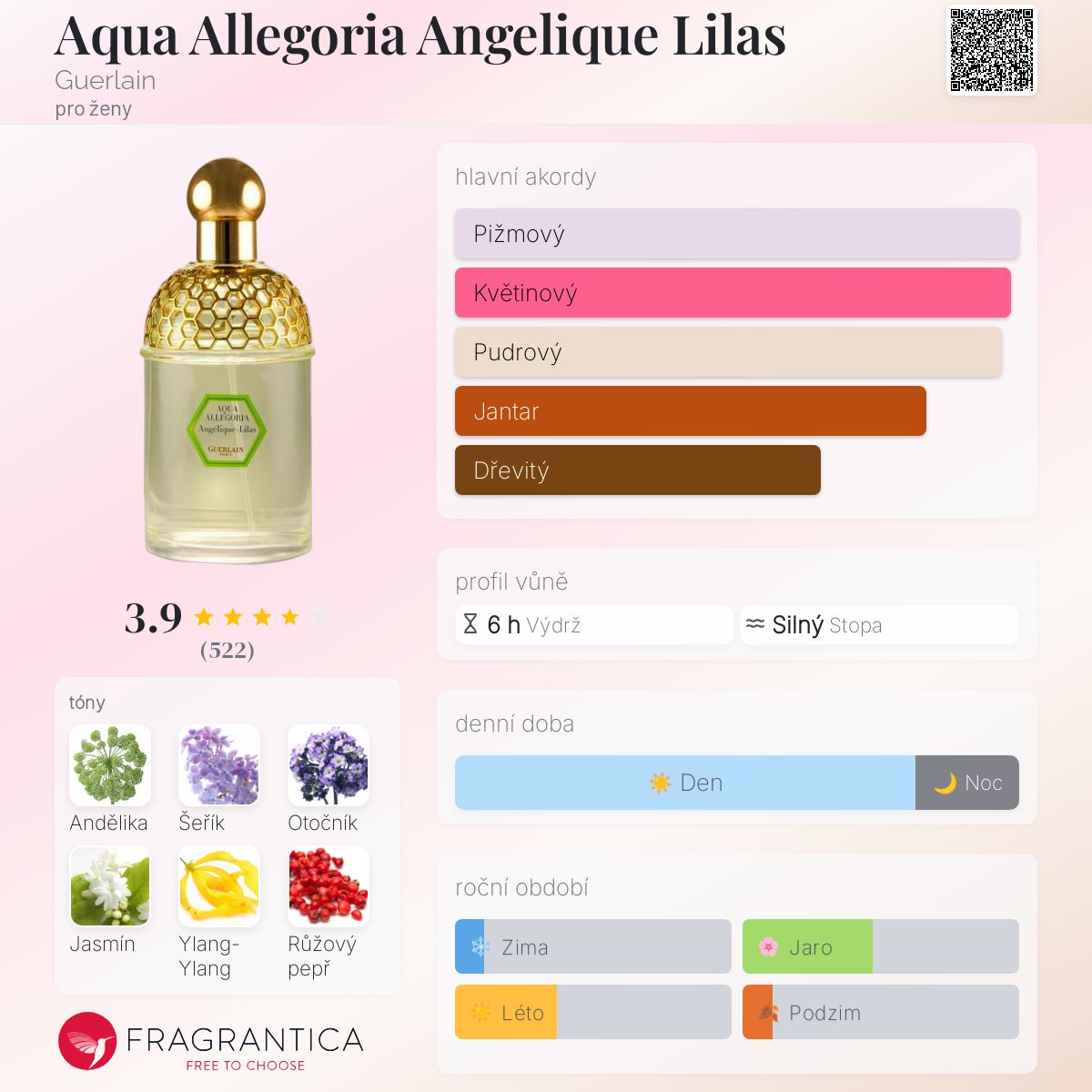 Aqua Allegoria Angelique Lilas podle Guerlain je Floral Green vůně pro ženy. Aqua Allegoria Angelique Lilas byl/a uveden/a v roce 2007. "Nosem" za touto vůní je Jean-Paul Guerlain. Vrchní tóny jsou Jasmín, Růžový pepř a Pomeranč; střední tóny jsouAndělika, Šeřík a Ylang-Ylang ; základní tóny jsou Otočník a Virginský cedr.