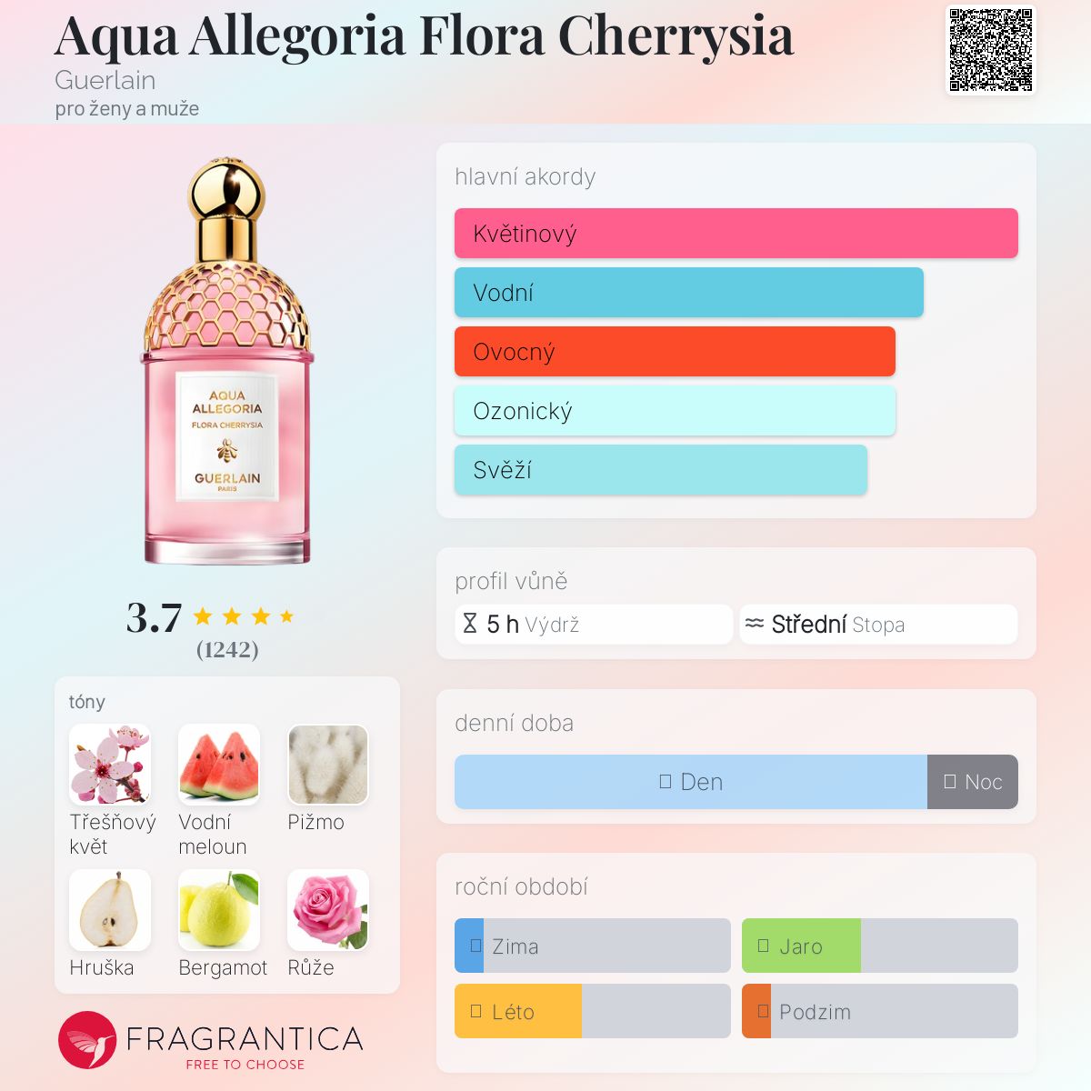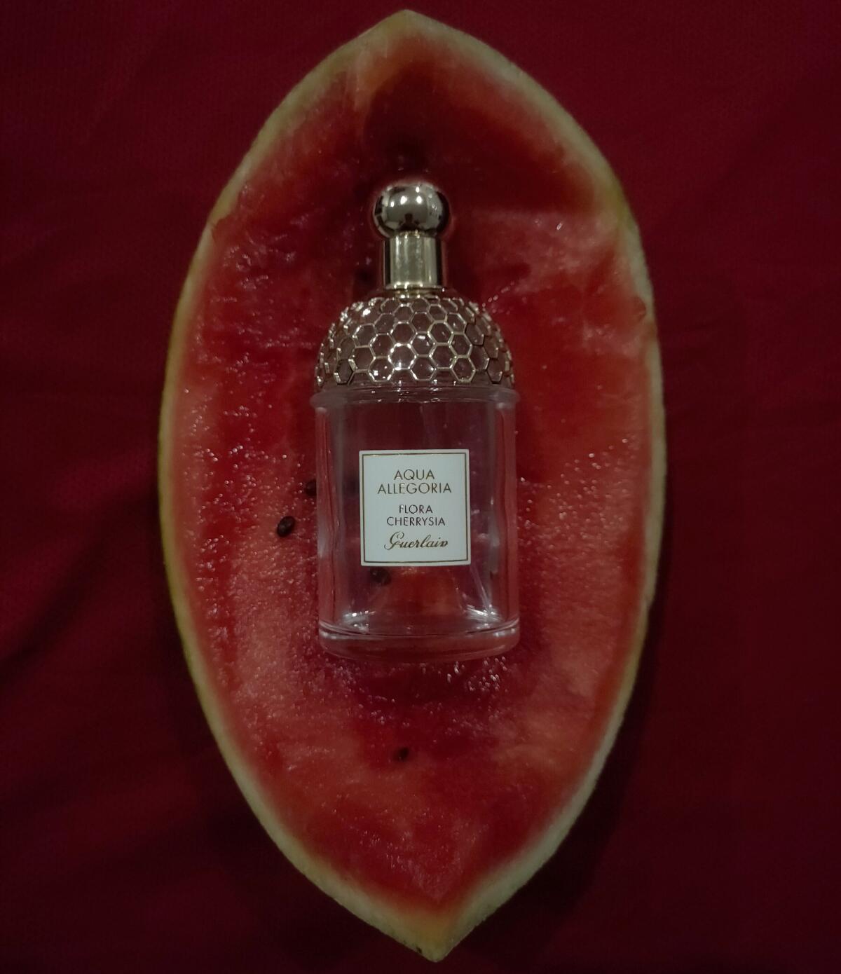 Aqua Allegoria Flora Cherrysia podle Guerlain je Aromatic Fruity vůně pro ženy a muže. Aqua Allegoria Flora Cherrysia byl/a uveden/a v roce 2019. "Nosem" za touto vůní je Thierry Wasser. Vrchní tóny jsou Vodní meloun a Kalábrijský bergamot; střední tóny jsouTřešňový květ, Hruška a Růže ; základní tóny jsou Bílé pižmo, Fialka a Dřevité tóny.