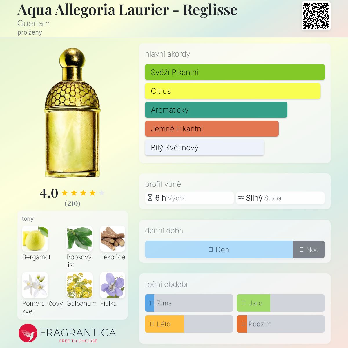Aqua Allegoria Laurier - Reglisse podle Guerlain je Aromatic Green vůně pro ženy. Aqua Allegoria Laurier - Reglisse byl/a uveden/a v roce 2008. Aqua Allegoria Laurier - Reglisse byl/a vytvořen/a Jean-Paul Guerlain, Marie Salamagne a Sylvaine Delacourte. Vrchní tóny jsou Bergamot a Pomerančový květ; střední tóny jsouBobkový list a Lékořice ; základní tóny jsou Galbanum, Fialka a Jantar (ambra).