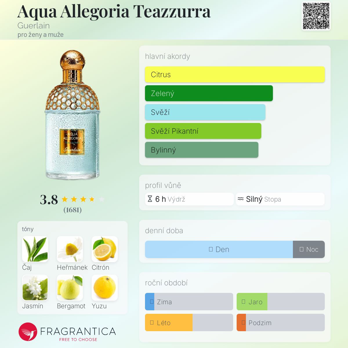 Aqua Allegoria Teazzurra podle Guerlain je Citrus Aromatic vůně pro ženy a muže. Aqua Allegoria Teazzurra byl/a uveden/a v roce 2015. "Nosem" za touto vůní je Thierry Wasser. Vrchní tóny jsou Citrón, Bergamot, Yuzu a Grapefruit; střední tóny jsouZelený čaj, Heřmánek a Jasmín ; základní tóny jsou Calone, Vanilka a Pižmo.