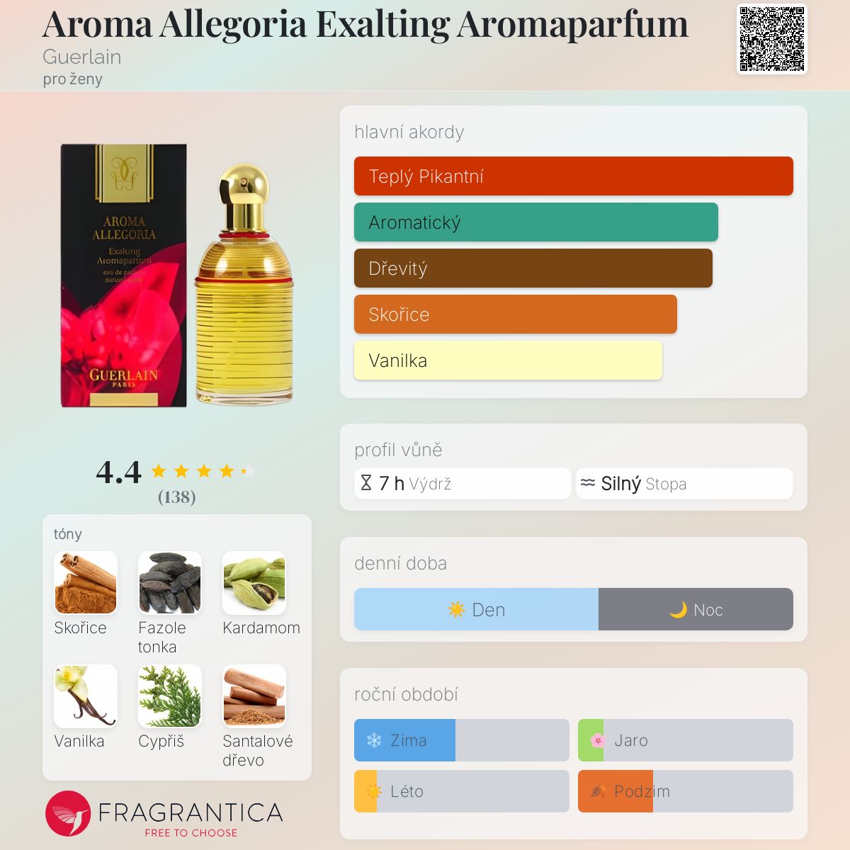 Aroma Allegoria Exalting Aromaparfum podle Guerlain je Orientální Woody vůně pro ženy. Aroma Allegoria Exalting Aromaparfum byl/a uveden/a v roce 2002. Vrchní tóny jsou Skořice, Cypřiš, Hořký pomeranč a Bergamot; střední tóny jsouKardamom, Koriandr, Virginský cedr a Neroli ; základní tóny jsou Fazole tonka, Vanilka, Santalové dřevo a Pepř.