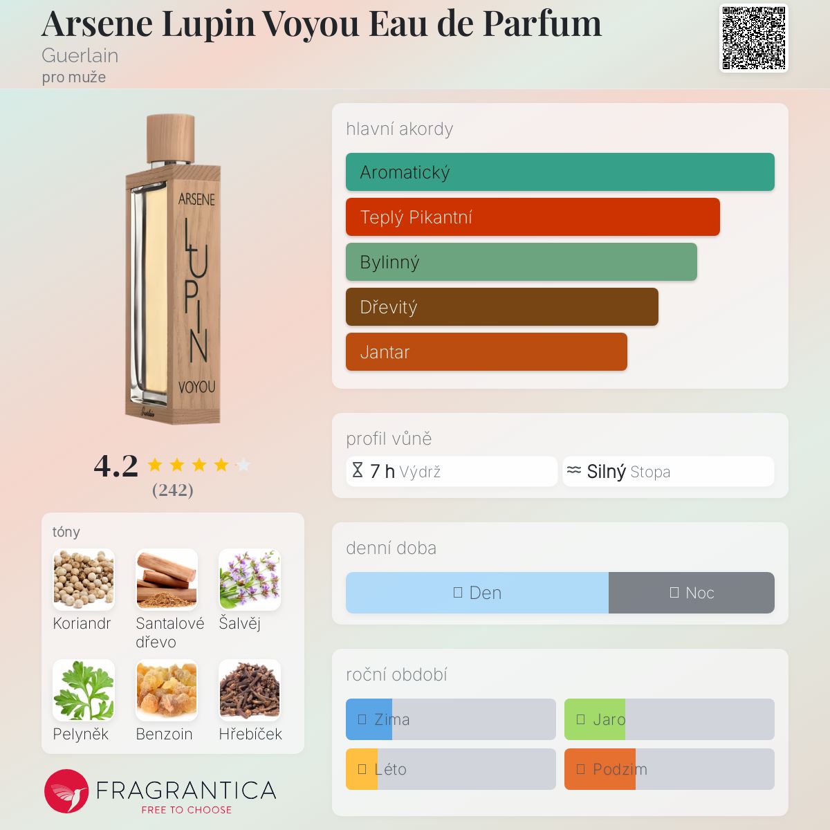 Arsene Lupin Voyou Eau de Parfum podle Guerlain je Chypre vůně pro muže. Arsene Lupin Voyou Eau de Parfum byl/a uveden/a v roce 2010. "Nosem" za touto vůní je Jean-Paul Guerlain. Vrchní tóny jsou Koriandr, Pelyněk, Citrón a Bergamot; střední tóny jsouŠalvěj, Hřebíček, Kardamom a Bulharská růže ; základní tóny jsou Santalové dřevo, Benzoin, Pačuli a Labdanum.