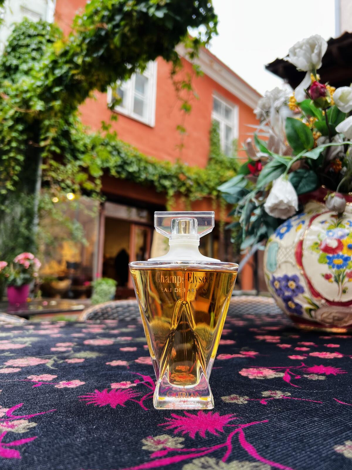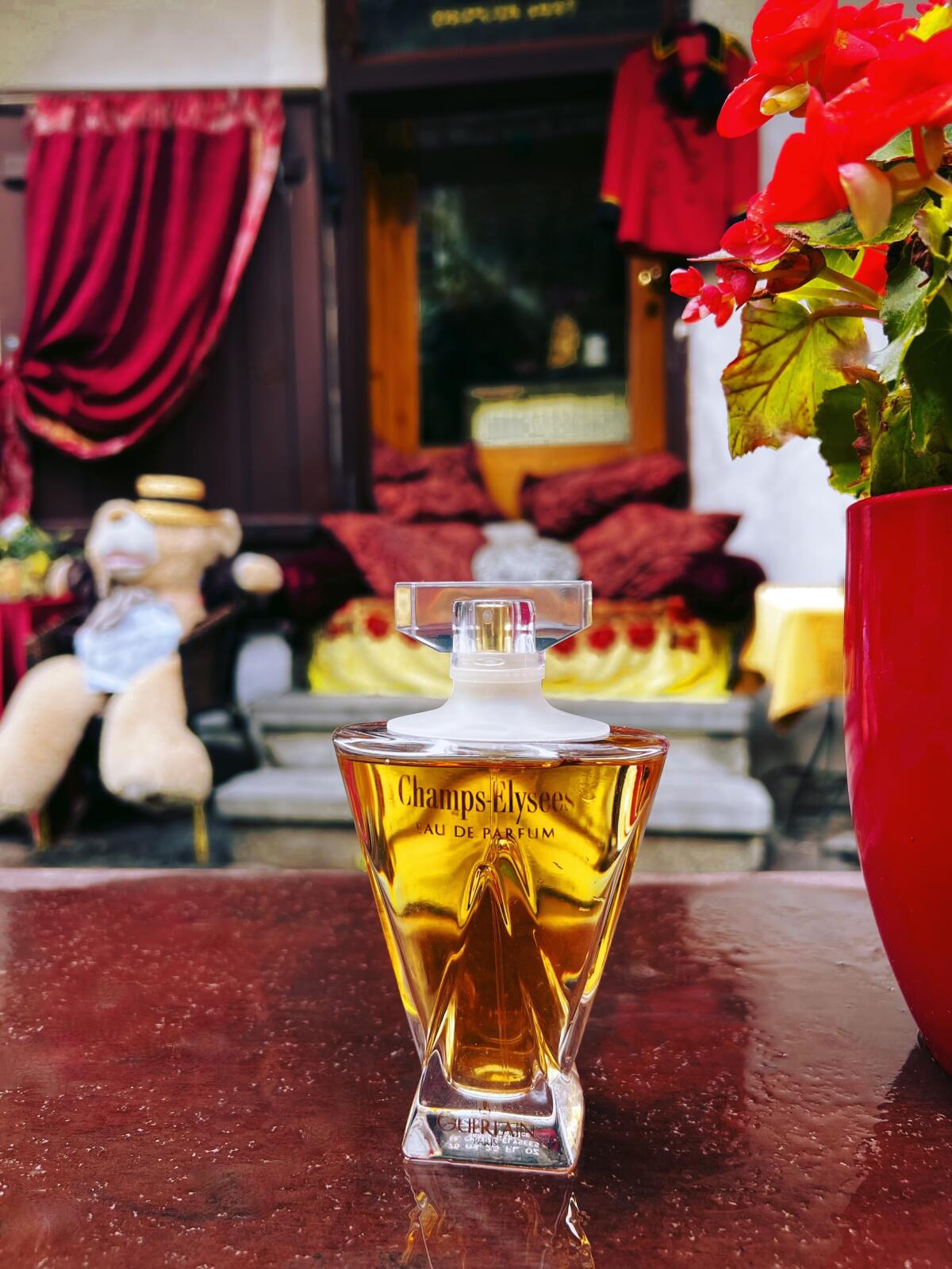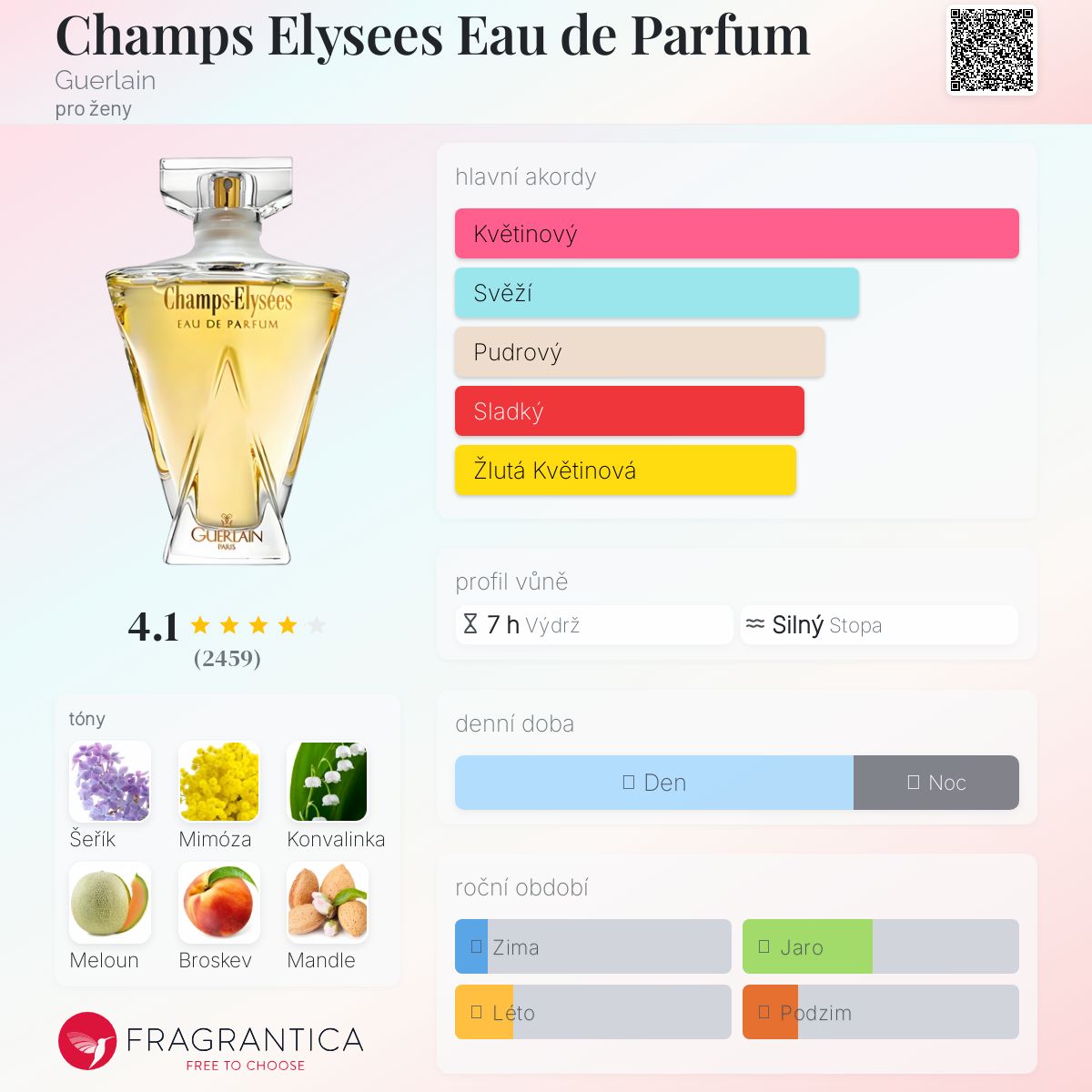 Champs Elysees Eau de Parfum podle Guerlain je Floral Fruity vůně pro ženy. Champs Elysees Eau de Parfum byl/a uveden/a v roce 1996. Champs Elysees Eau de Parfum byl/a vytvořen/a Jacques Guerlain, Jean-Paul Guerlain a Olivier Cresp. Vrchní tóny jsou Meloun, Broskev, Mandle, Fialka, Černý rybíz a Anýz; střední tóny jsouŠeřík, Mimóza, Konvalinka, Pivoňka, Mandlový květ , Růže a Ibišek ; základní tóny jsou Vanilka, Santalové dřevo, Mandloň, Benzoin a Cedr.