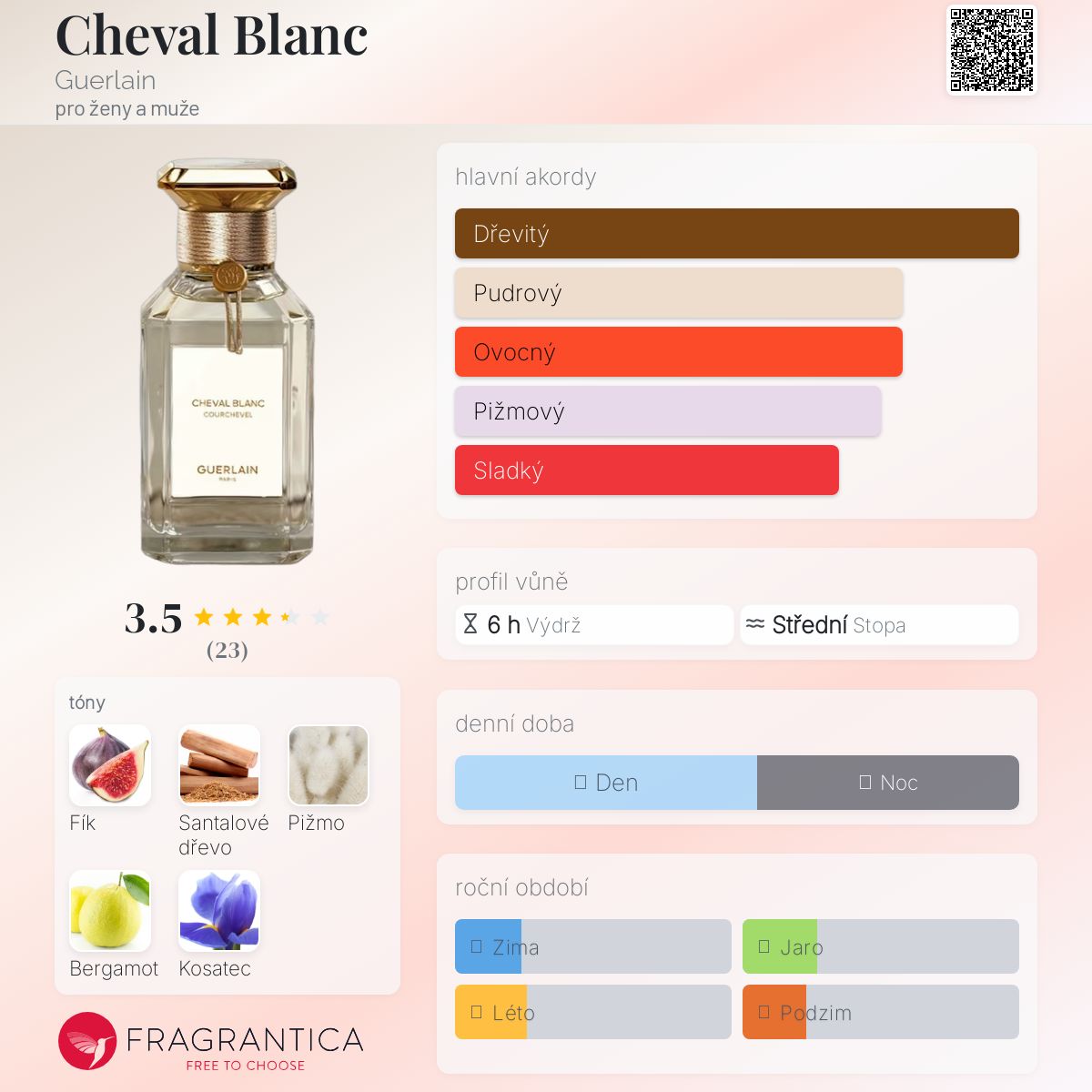 Cheval Blanc podle Guerlain je vůně pro ženy a muže. Cheval Blanc byl/a uveden/a v roce 2023. Vrchní tóny jsou Fík a Bergamot; střední tón jeKosatec ; základní tóny jsou Santalové dřevo a Bílé pižmo.