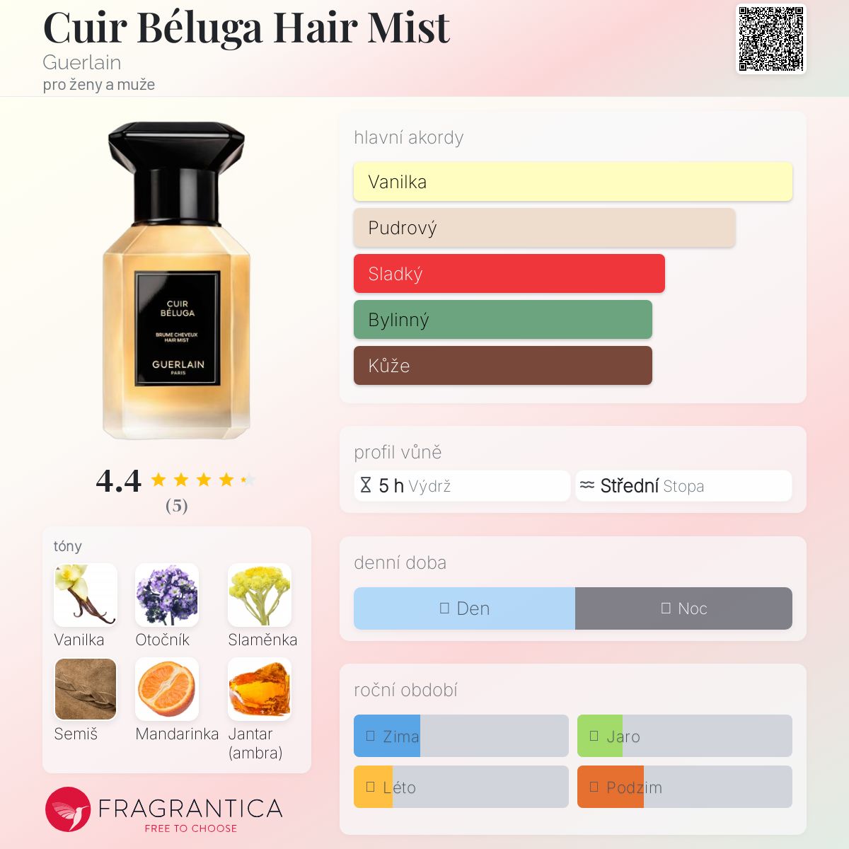 Cuir Béluga Hair Mist podle Guerlain je vůně pro ženy a muže. Toto je nová vůně. Cuir Béluga Hair Mist byl/a uveden/a v roce 2025. "Nosem" za touto vůní je Olivier Polge. Vrchní tóny jsou Mandarinka a Aldehydy; střední tóny jsouSlaměnka a Pačuli ; základní tóny jsou Vanilka, Otočník, Semiš a Jantar (ambra).