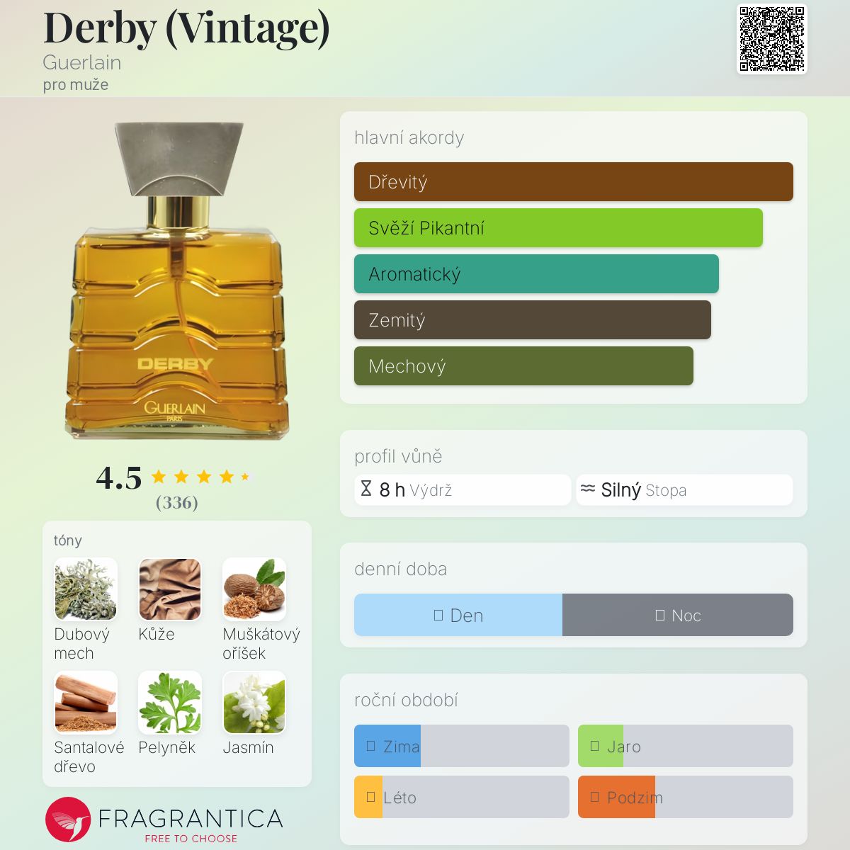 Derby (Vintage) podle Guerlain je Chypre vůně pro muže. Derby (Vintage) byl/a uveden/a v roce 1985. "Nosem" za touto vůní je Jean-Paul Guerlain. Vrchní tóny jsou Pelyněk, Bergamot, Máta a Citrón; střední tóny jsouMuškátový květ, Jasmín a Růže ; základní tóny jsou Dubový mech, Kůže, Santalové dřevo, Pačuli a Vetiver.