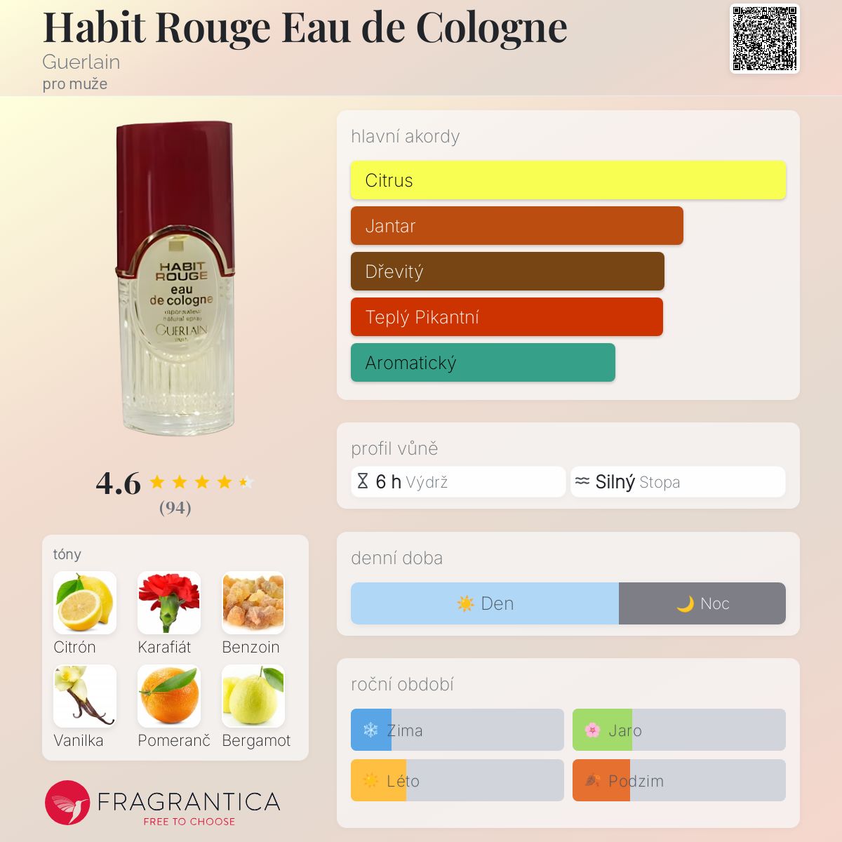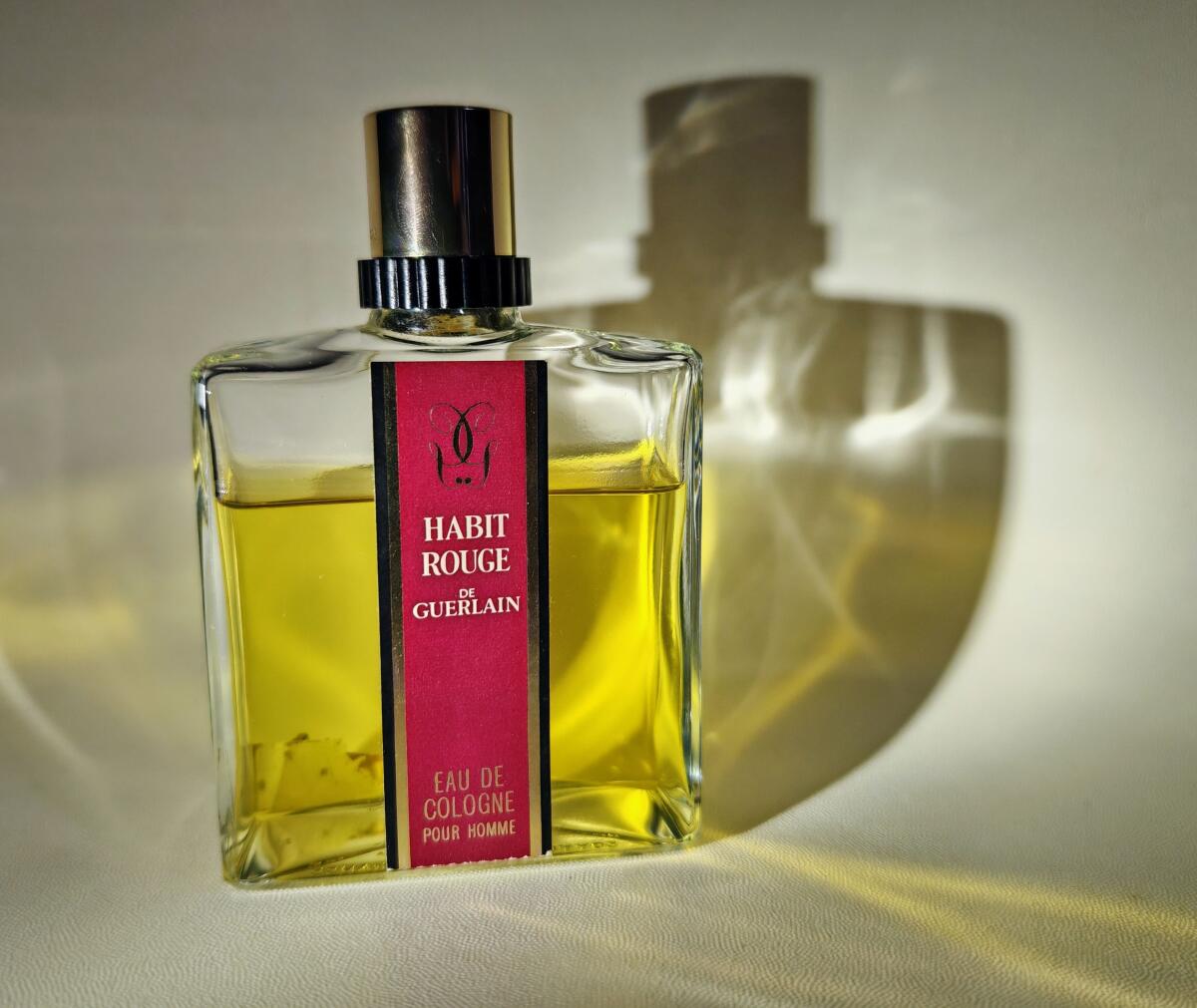Habit Rouge Eau de Cologne podle Guerlain je Orientální Woody vůně pro muže. Habit Rouge Eau de Cologne byl/a uveden/a v roce 1965. "Nosem" za touto vůní je Jean-Paul Guerlain. Vrchní tóny jsou Citrón, Pomeranč, Bergamot, Mandarinka, Palisandr, Bazalka a Limetka; střední tóny jsouKarafiát, Růže, Jasmín, Santalové dřevo, Pačuli, Skořice a Extrakt z bílého cedru ; základní tóny jsou Benzoin, Vanilka, Jantar (ambra), Dubový mech, Labdanum a Kůže.