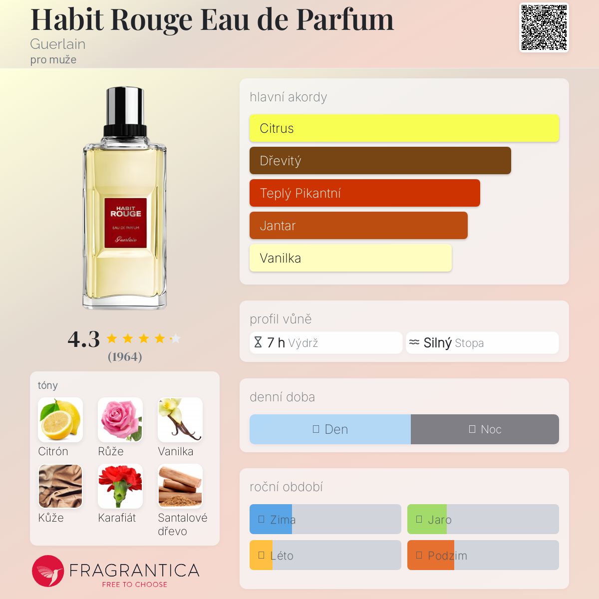 Habit Rouge Eau de Parfum podle Guerlain je Orientální Woody vůně pro muže. Habit Rouge Eau de Parfum byl/a uveden/a v roce 2003. "Nosem" za touto vůní je Jean-Paul Guerlain. Vrchní tóny jsou Citrón, Bergamot, Brazilské červené dřevo, Pomeranč, Limetka, Mandarinka a Bazalka; střední tóny jsouRůže, Karafiát, Santalové dřevo, Pačuli, Cedr, Skořice a Jasmín ; základní tóny jsou Vanilka, Kůže, Benzoin, Jantar (ambra), Labdanum, Dubový mech a Agarové dřevo (oud).