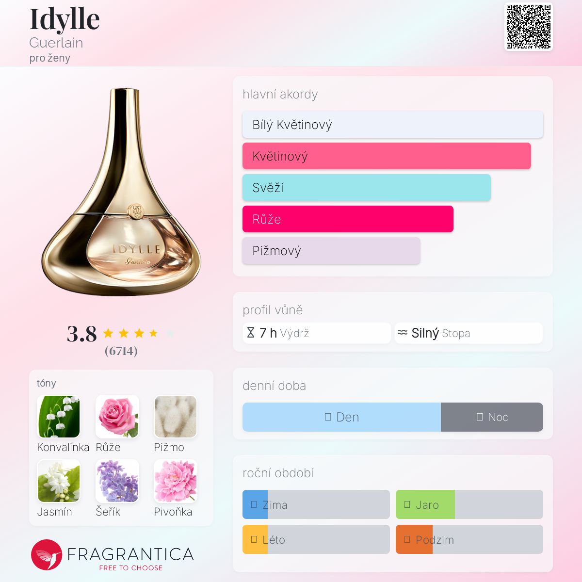 Idylle podle Guerlain je Floral vůně pro ženy. Idylle byl/a uveden/a v roce 2009. "Nosem" za touto vůní je Thierry Wasser. Vrchní tóny jsou Tinktura z růže, Frézie, Liči a Maliny; střední tóny jsouKonvalinka, Jasmín, Šeřík, Pivoňka a Lilie ; základní tóny jsou Pižmo a Pačuli.