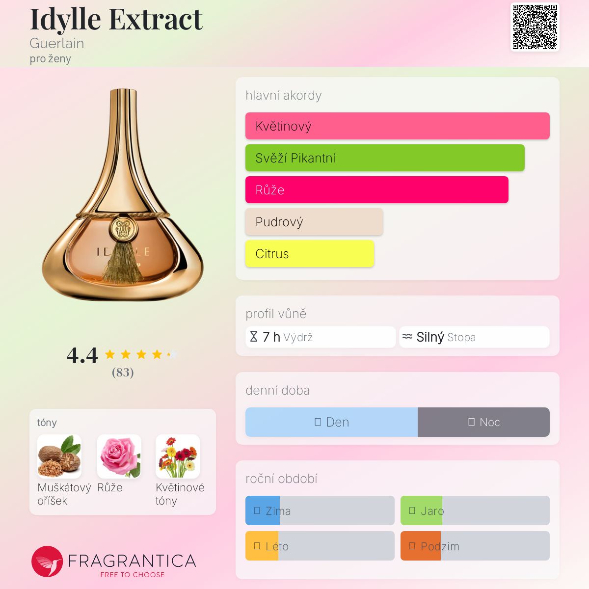 Idylle Extract podle Guerlain je Chypre vůně pro ženy. "Nosem" za touto vůní je Thierry Wasser. Vrchní tón je Květinové tóny ; střední tón jeRůže ; základní tón je Muškátový oříšek.