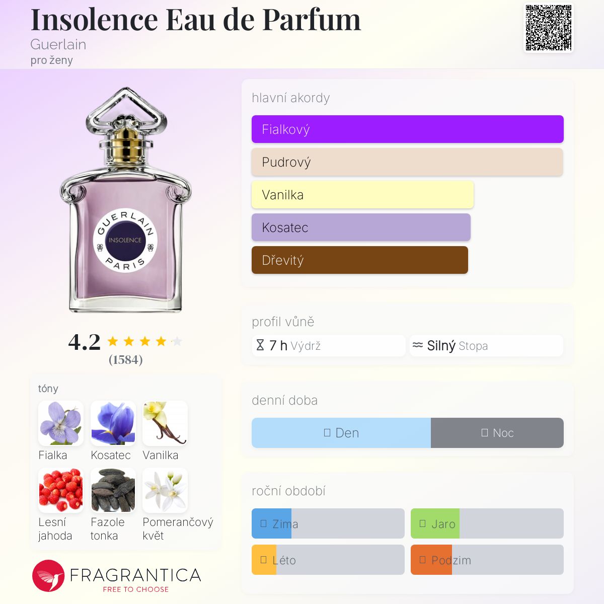Tento parfém není Insolence... pokud změní složení, měli by změnit i název vůně. Můj oblíbený parfém od roku 2009, kdy jsem ho objevila, před pár lety mi došel a nedávno jsem si ho koupila. Nejnovější verze s flakonkem, který je méně než původní a objemný, nemá s tím starým nic společného, je mnohem jemnější, když ten starý byl velmi živý a až štiplavý a pokud jste se moc nastříkali, byli jste ztraceni, protože se vám zaručeně točila hlava.