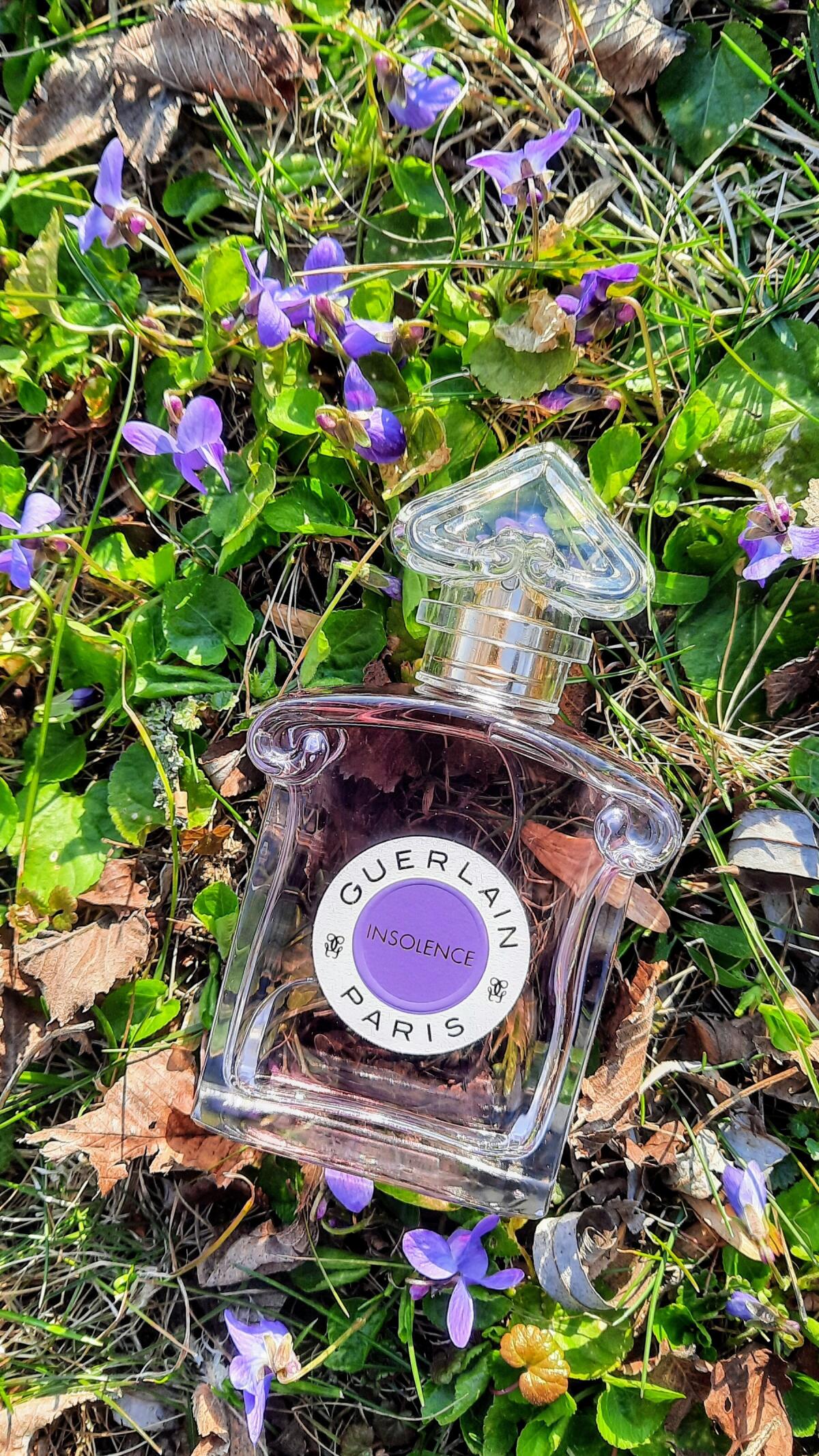 Parfém Guerlain má několik zajímavých nuancí, takže není úplně solinota. V horní části je Insolence samozřejmě čistá fialka, ale připadá mi velmi svěží a mýdlová. I když je to parfém rozhodně sladký, přijde mi, že je také velmi čistý, a to natolik, že jsou chvíle, kdy mi připomíná vůni odličovacích ubrousků. Na pleti si okamžitě všimnu vanilky a pomerančového květu. Cítím také takový lehce nakyslý tón, který je popisován jako jahoda, což si nemyslím, že je nutně ovocný, ale který dokáže dodat potřebnou protiváhu té velmi silné fialce.