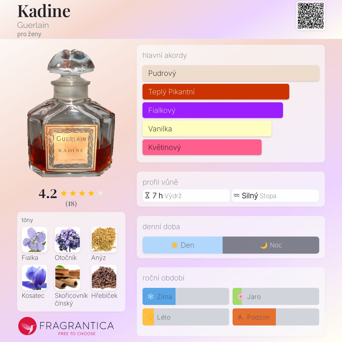 Kadine podle Guerlain je Floral vůně pro ženy. Kadine byl/a uveden/a v roce 1911. "Nosem" za touto vůní je Jacques Guerlain. Vrchní tóny jsou Anýz a Bergamot; střední tóny jsouOtočník, Bourbonská kasie, Hřebíček, Skořice a Jasmín ; základní tóny jsou Fialka, Kosatec a Vanilka.