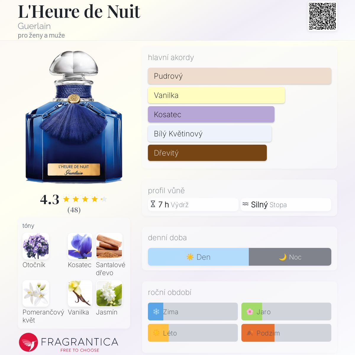 L'Heure de Nuit podle Guerlain je Floral Woody Musk vůně pro ženy a muže. L'Heure de Nuit byl/a uveden/a v roce 2016. "Nosem" za touto vůní je Thierry Wasser.