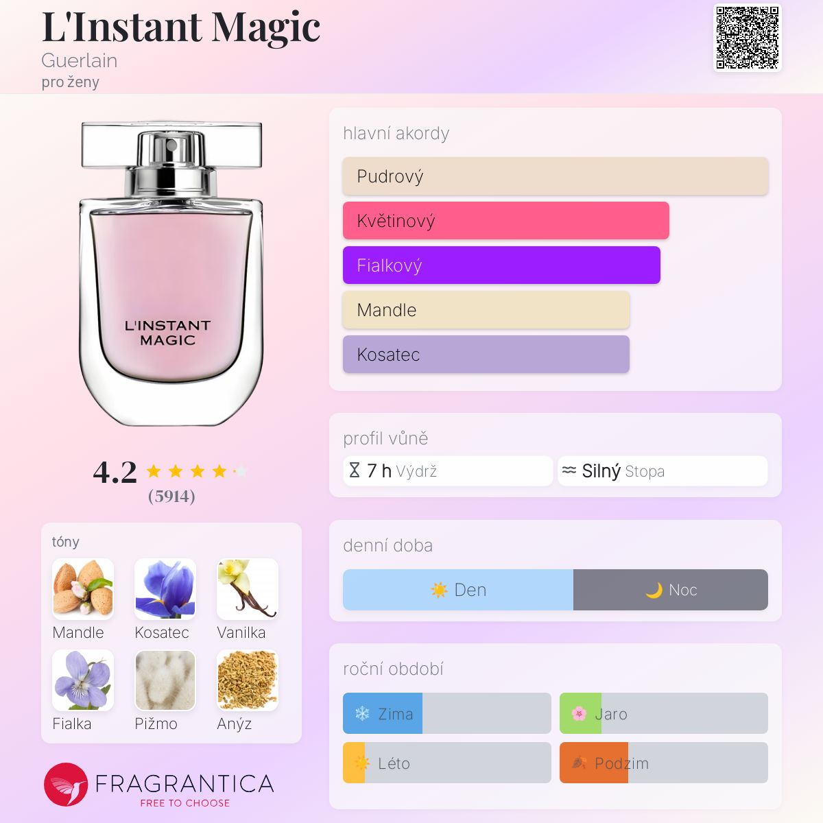 L'Instant Magic podle Guerlain je Floral Woody Musk vůně pro ženy. L'Instant Magic byl/a uveden/a v roce 2007. L'Instant Magic byl/a vytvořen/a Sylvaine Delacourte a Randa Hammami. Vrchní tóny jsou Anýz, Bergamot a Citrón; střední tóny jsouFialka, Mimóza, Růže, Frézie a Karafiát ; základní tóny jsou Mandle, Kosatec, Vanilka, Bílé pižmo, Santalové dřevo a Cedr.