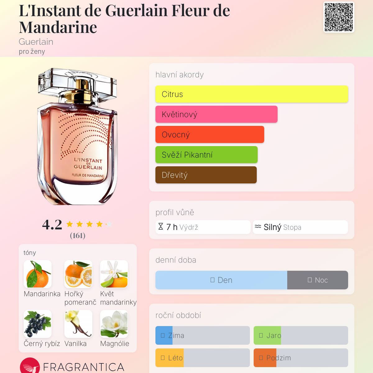 L'Instant de Guerlain Fleur de Mandarine podle Guerlain je Orientální Floral vůně pro ženy. L'Instant de Guerlain Fleur de Mandarine byl/a uveden/a v roce 2007. "Nosem" za touto vůní je Maurice Roucel. Vrchní tóny jsou Mandarinka, Hořký pomeranč a Bergamot; střední tóny jsouMandarinkový květ, Černý rybíz, Magnólie a Hyacint ; základní tóny jsou Vanilka, Cedr a Pižmo.