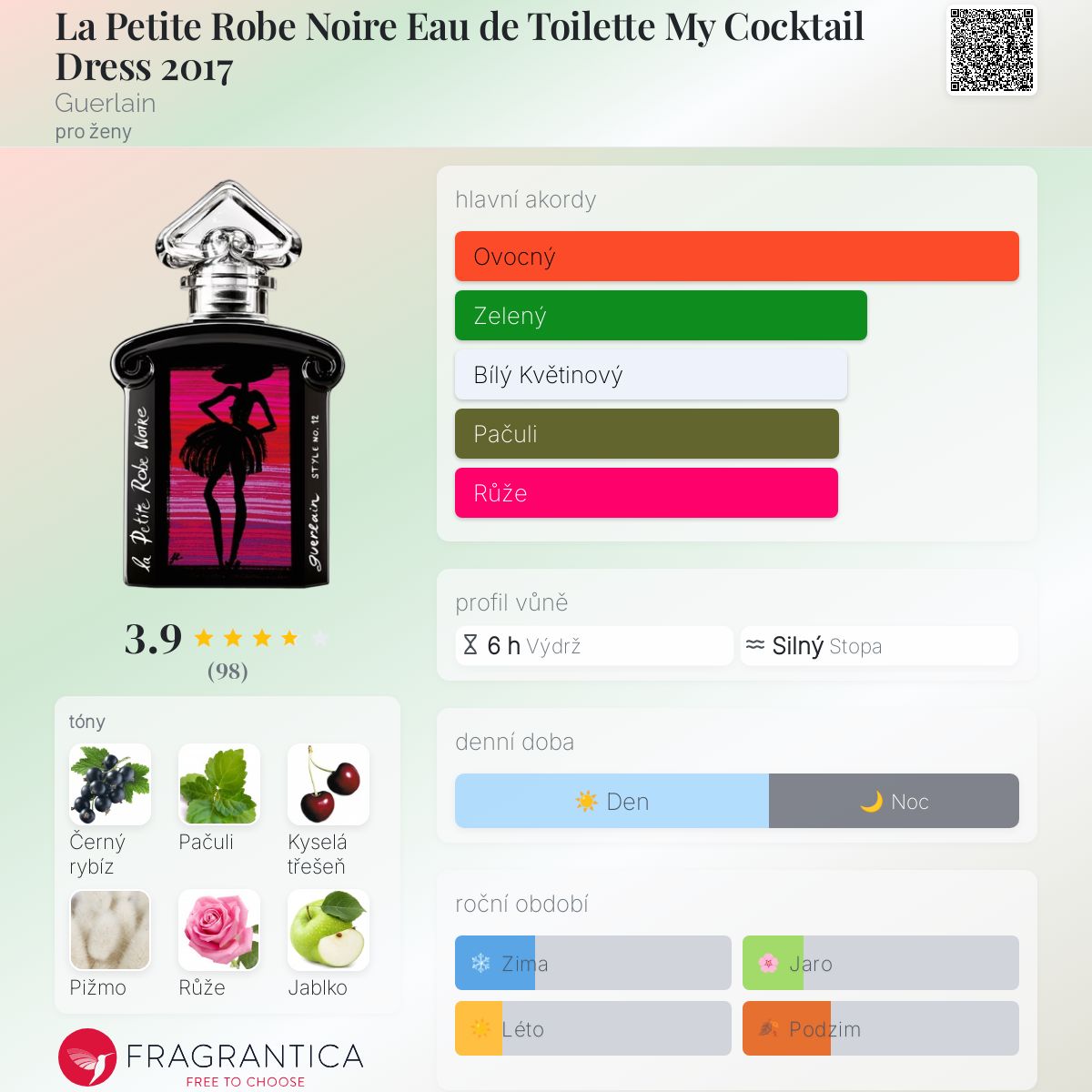 La Petite Robe Noire Eau de Toilette My Cocktail Dress 2017 podle Guerlain je Floral Fruity vůně pro ženy. La Petite Robe Noire Eau de Toilette My Cocktail Dress 2017 byl/a uveden/a v roce 2017. "Nosem" za touto vůní je Thierry Wasser. Vrchní tóny jsou Růže, Zelené tóny a Jasmín; střední tóny jsouČerný rybíz, Kyselá třešeň, Jablko a Pomerančový květ ; základní tóny jsou Pačuli, Pižmo a Jantar (ambra).